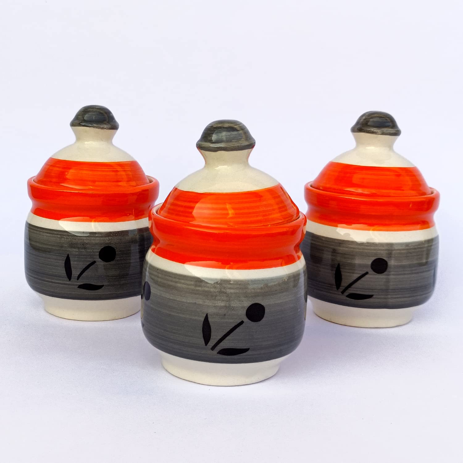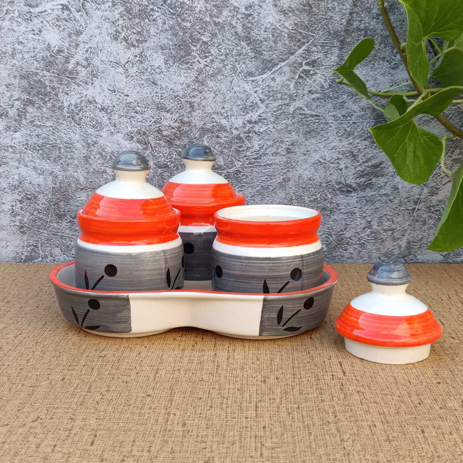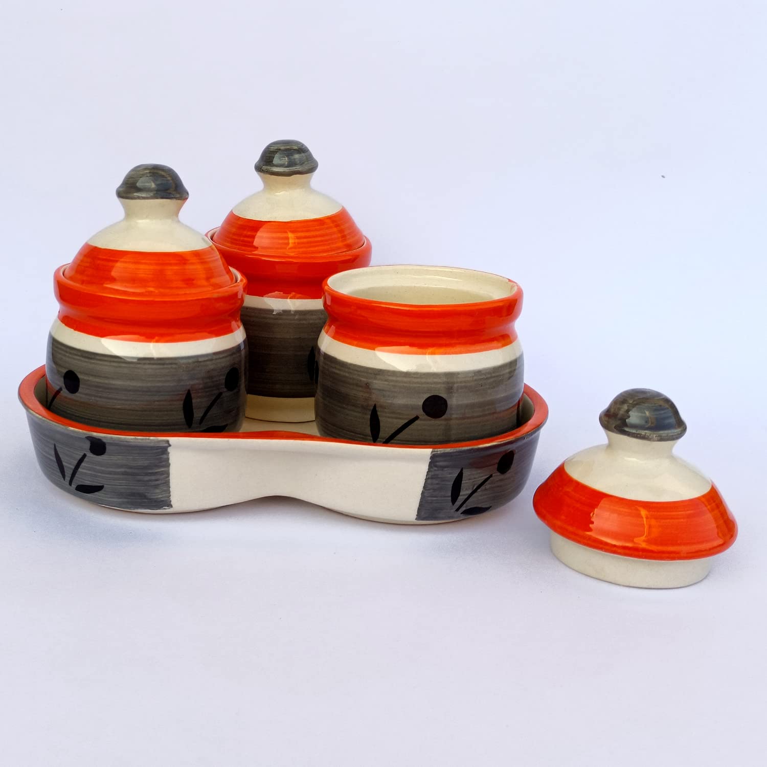 Made in India for an initiative of Aatam Nirbhar Bharat A Product with simple handle and detailed with Handpainted Glaze. Handmade and hand glazed with love from the interiors of India. They make the perfect addition to any kitchen and table spaces as art pieces displaying an exemplary glimpse of studio pottery from India. Those who love their food love their kitchen will definitely love this modern product. Best for serving casually or occasionally at one on Breakfast Lunch & Dinner time. Tip to bottom is 100% handmade with fine details. An ideal gift for housewarming party. Comes in a set of 3 Jars & 1 Tray. The product is lead free. The product is dishwasher & microwave safe.