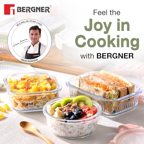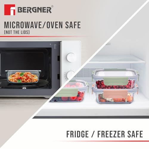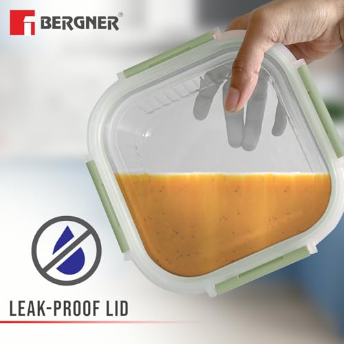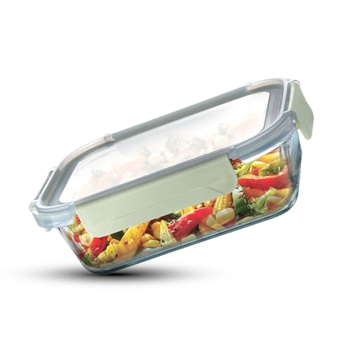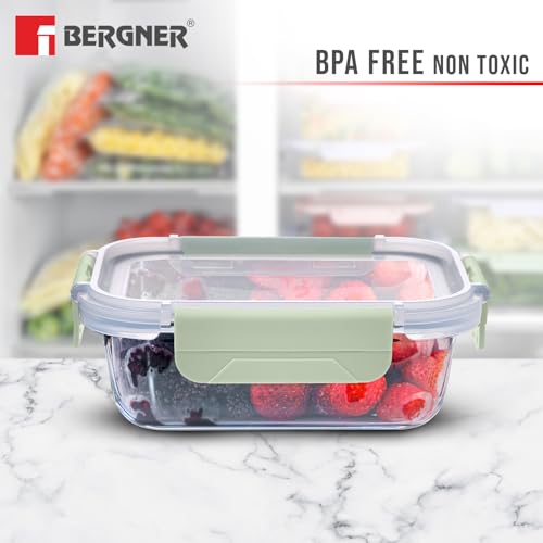 Bergner Smart Lock Borosilicate Rectangular 1.5 L Food Container for Kitchen/Tiffin, Air-Tight Lid with Locking Tabs, Space Saving, Stackable, Microwave & Oven Safe, Food Safe, Dishwasher Safe - Green