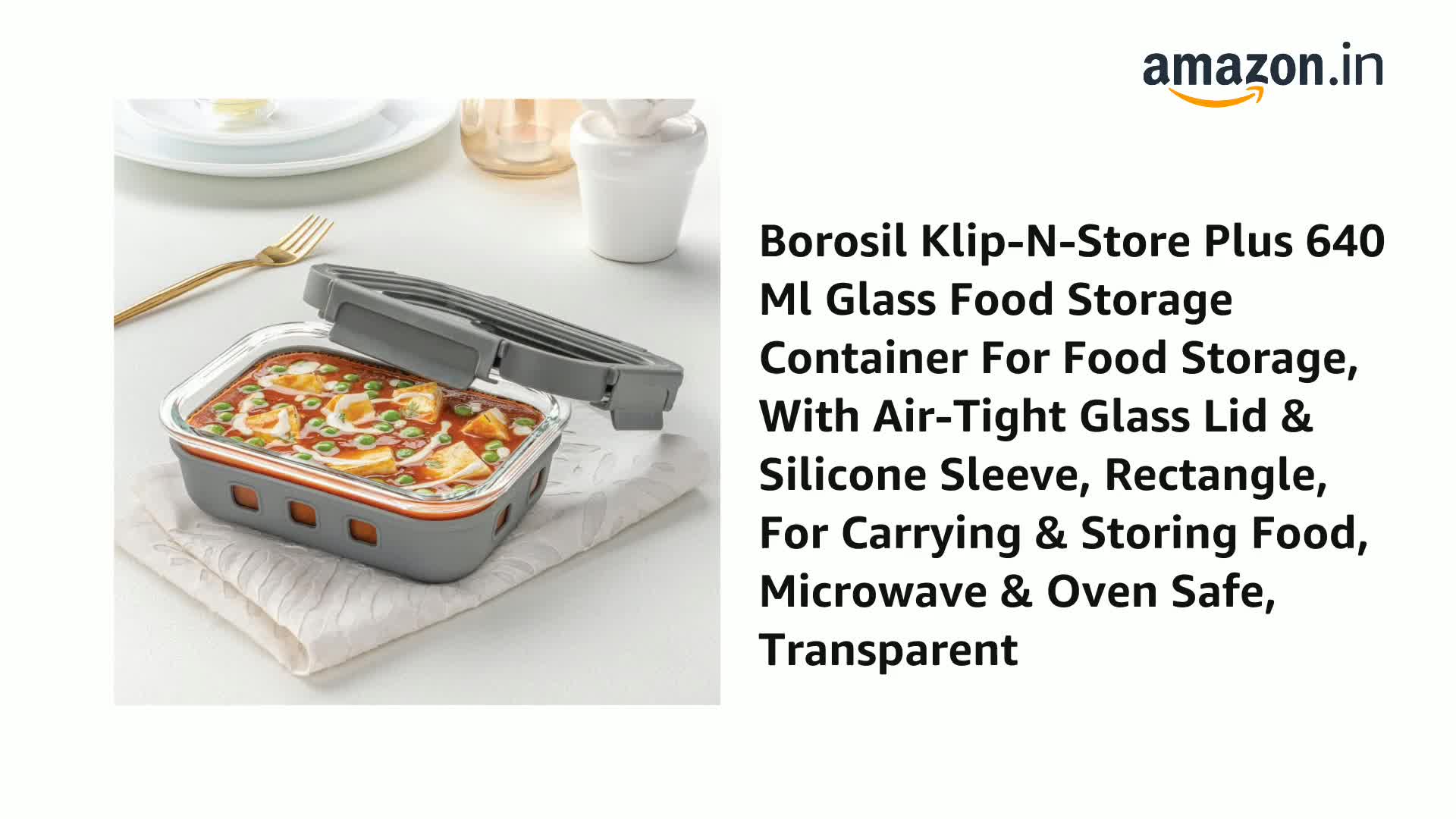 HomeKitchenContainersJars & ContainersBorosil Klip N Store Plus 640 ml Rectangle Glass Food Storage Container with Air Tight Glass Lid | Borosilicate Glass Container for Lunchbox | Microwave & Dishwasher Safe | Transparent