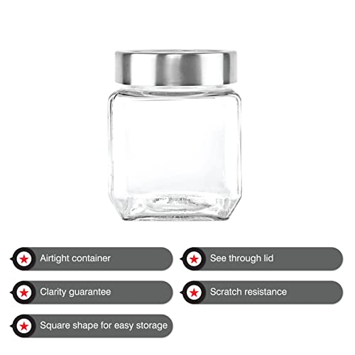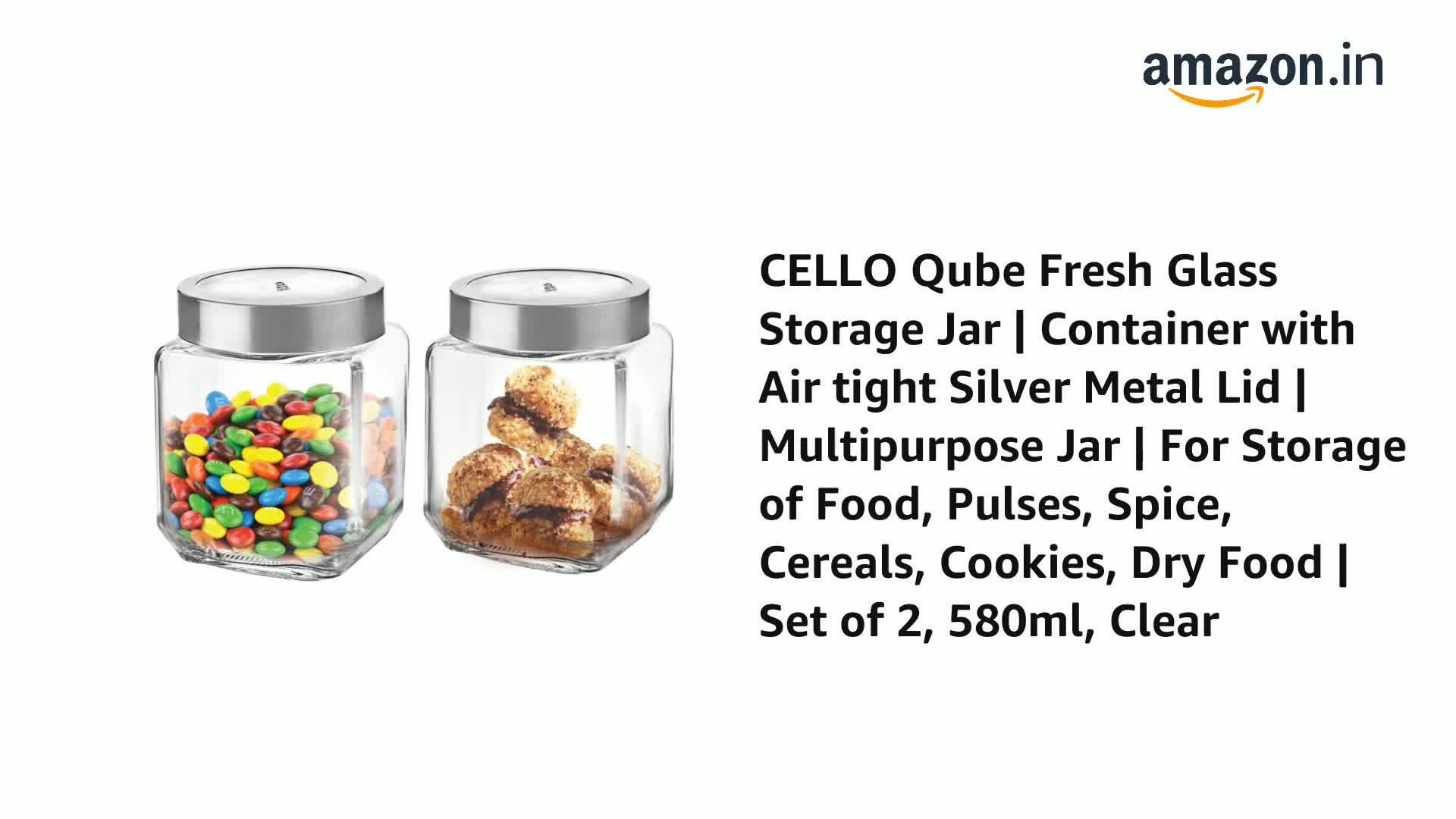 CELLO Qube Fresh Glass Storage Jar | Container with Air tight Silver Metal Lid | Multipurpose Jar | For Storage of Food, Pulses, Spice, Cereals, Cookies, Dry Food | Set of 2, 580ml, Clear