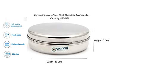 Coconut Multipurpose Chocolate Box Stainless steel Storage box is range of innovative and quality products for home and kitchen.Product is made from superior quality Stainless steel. It is sturdy and easy to clean / maintain. Product body is made from jointless technology and hence will not leak or rust even in tough conditions. Easy to clean and diswasher safe.Container 1 - 6.5 Inches Width & 1.5 Inches Height.