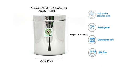 Product Content : Coconut Stainless Steel Plain Deep Dabba /Storage Container - Size - 12 Capacity - 1000ML Dimension - Width -13 Cm & Height -15 Cm