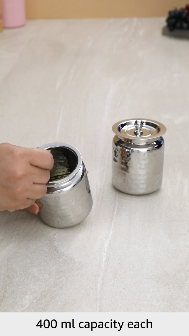 Product Content : SS Hammered China Bharani Ghee Pot with SS Lids - Set of 2 Pieces Capacity - 400ML Each. Product Dimension ( Hammered China Bharani GP 07 - Size No. 3 - Width - 8 Cm Height - 10.5 Cm )