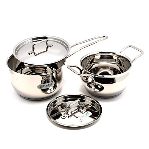 Coconut is a range of Innovative and products for Home and Kitchen Utilities. Triply Sauce Pan is made with base that has blend of three metals that is quite strong and it is great addition to your kitchen cuboards.This pan makes it easy to cook food faster and evenly. The product is made from stainless steel hence has a strong build. The bottom sandwich steel makes it more durable. The handle doesn’t shake or loosen because it is riveted in place. It is non-corrosive surface makes it free from rust. The bottom of the vessel is made with triply making it stronger and helps it to cook food faster and evenly due to which the food doesn’t stick to the bottom and conserves fuel too. This is Gas & Induction Compactible . Product content : SS Sauce Pan(1000ML) & (Rexona (1500ML) - Set of 2 Quantity.