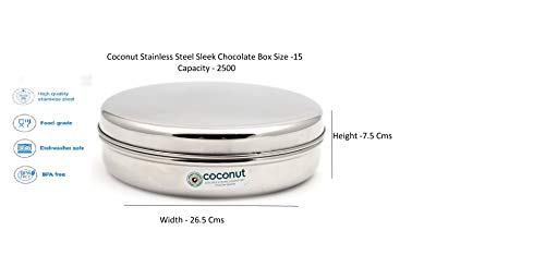 Coconut is range of innovative and products for Home and Kitchen. Coconut Multipurpose Stainless Steel Storage box is idealy used for storing roti chapati snacks cake and what not. Stackable and multipurpose. Coconut products are made from checked to ensure that they just dont look good in images but in reality serve your need in reality. Product is made from Stainless steel which will not crack rust or pit. Coconut Label is a mark of and products are against any manufacturing defects or faulty workmanship Product body is made from jointless technology and hence will not leak or rust even in tough conditions. Product Content: Coconut Stainless Steel Sleek Chocolate Box No. 15 1 unit. Capacity 2500 ML Dimension - Width 26.5 Cms & Height -7.5 Cms.