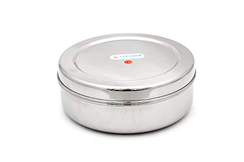 Coconut is range of innovative and products for home and kitchen. Through canister can used to store Puris Rotis Parathas Snacks Khakhara mukhwas dryfruits choclates buiscuits etc. This flat storage container is rust proof and hygienic. Made from 100% food grade stainless steel making it highly durable and resistance to corrosion.Easy to clean and diswasher safe. Wipe with cloth after washing to maintain the shine. Container 1 - 11.4 Inches Width & 3.5 Inches Height.