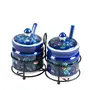 KHURJA POTTERY Ceramic Jar Set with Iron Stand 2 Spoon & Matching Lid for Storage Pickle (Blue) 300 ML