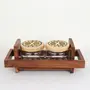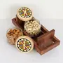Transparent Glass Jar Set of 2 with Handpainted Wooden Lids the perfect blend of functionality and elegance for your home. Elevate your kitchen or dining table with these beautifully crafted jars that combine style utility and a touch of rustic charm. These glass jars are designed to provide a clear view of the contents inside allowing you to showcase the vibrant colors and textures of your favorite ingredients from colorful spices to delectable sweets. The glass jar set features intricately handpainted wooden lids that add an artisanal touch to your kitchen decor. Each lid is a unique piece of art adding warmth and character to your home. To make your dining experience even more special our glass jar set comes with a matching wooden tray. The tray not only adds a cohesive look to your table but also makes it easy to carry and display your jars with elegance.