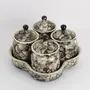 DESCRIPTION:Hand-painted by our expert artists representing a grey smokey marble-like appearance these four jars with lids and a perfectly shaped base tray in Ceramic is an indispensable addition to your kitchen & dining table in your home office canteen restaurants and cafs for storing & serving various type of sauces chutneys pickles vinegar etc. Its beautiful design & amazing shape make it enhance the quality of your mealtimes. Gift these to your dearest ones on festivals housewarming or anniversary parties.FEATURES:Handcrafted in ceramic this combo comes with four jars each with a detachable lid and a base tray.The marble-like jars with greyish hand-painted veins are curated to serve you sauces chutneys vinegar pickles etc.The tray is created in such a way that it perfectly fits the four jars.The lids come with a rounded handle on the top.Use this jar set on your dining table kitchen at home office canteen restaurants or cafs.Makes for an unusual but cherished & essential gift for your friends and family.NOTE:Please refer to the dimensions in the image.There may be a slight variation in the glazing color or finish of the product as the glazing is done inside the furnace at a very high temperature to make the product strong and sturdy.Due to the firing done it is also sometimes impossible to predict the color of the glazing or finish. Hence the actual product may differ slightly from the images.The hand-painting may differ slightly from the product image.This product is not made of Bone China.CARE INSTRUCTIONS:Handle with care.Wash gently with a mild detergent.Do not use any abrasive substance for cleaning.
