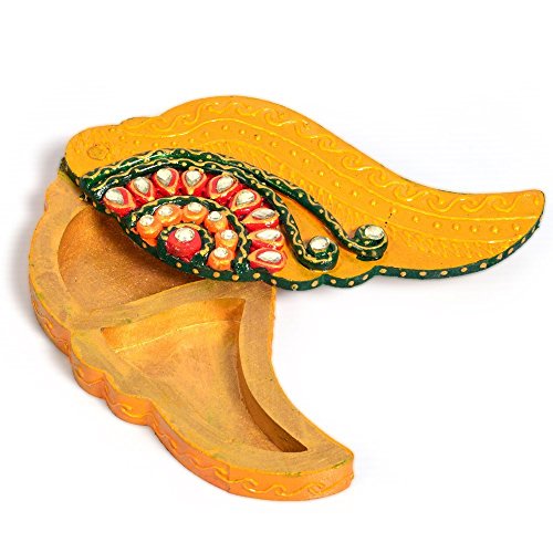 This colourful handcrafted shankh shaped kundan container is made up of wood. The body of the container is decorated with kundan and flawless colors on the lid which could be closed after use. It is also an ideal gift for your friends and relatives. The gift piece has been prepared by the master artisans of jaipur.