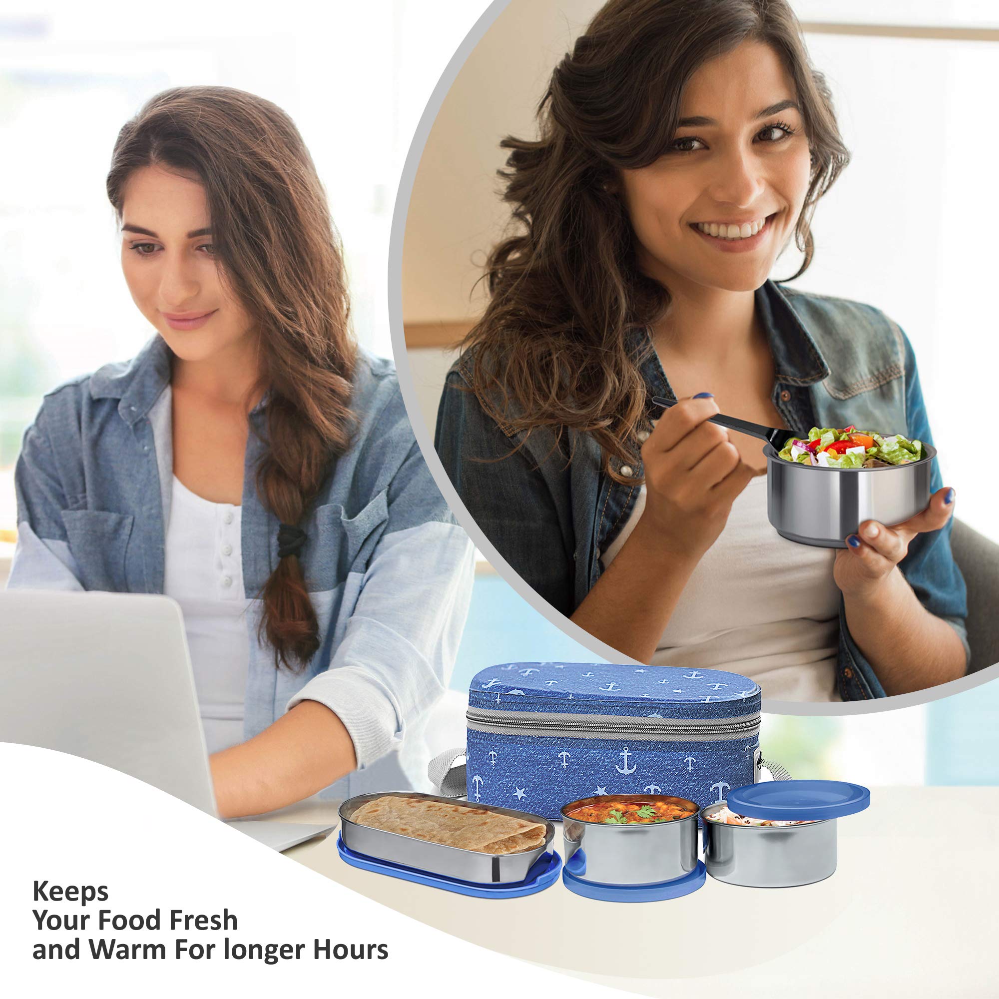 Corporate lunch from milton soft line range is an insulated lunch box by means of a softer outer jacket that will keep your food hot. It has 2 round stainless steel containers which is 100 percent leak - proof. It comes with an additional oval steel container which is ideal for keeping rice and rotis. Stainless steel fork and spoon is also provided which has a special storage slot in the jacket. This is ideal for office schools and colleges.