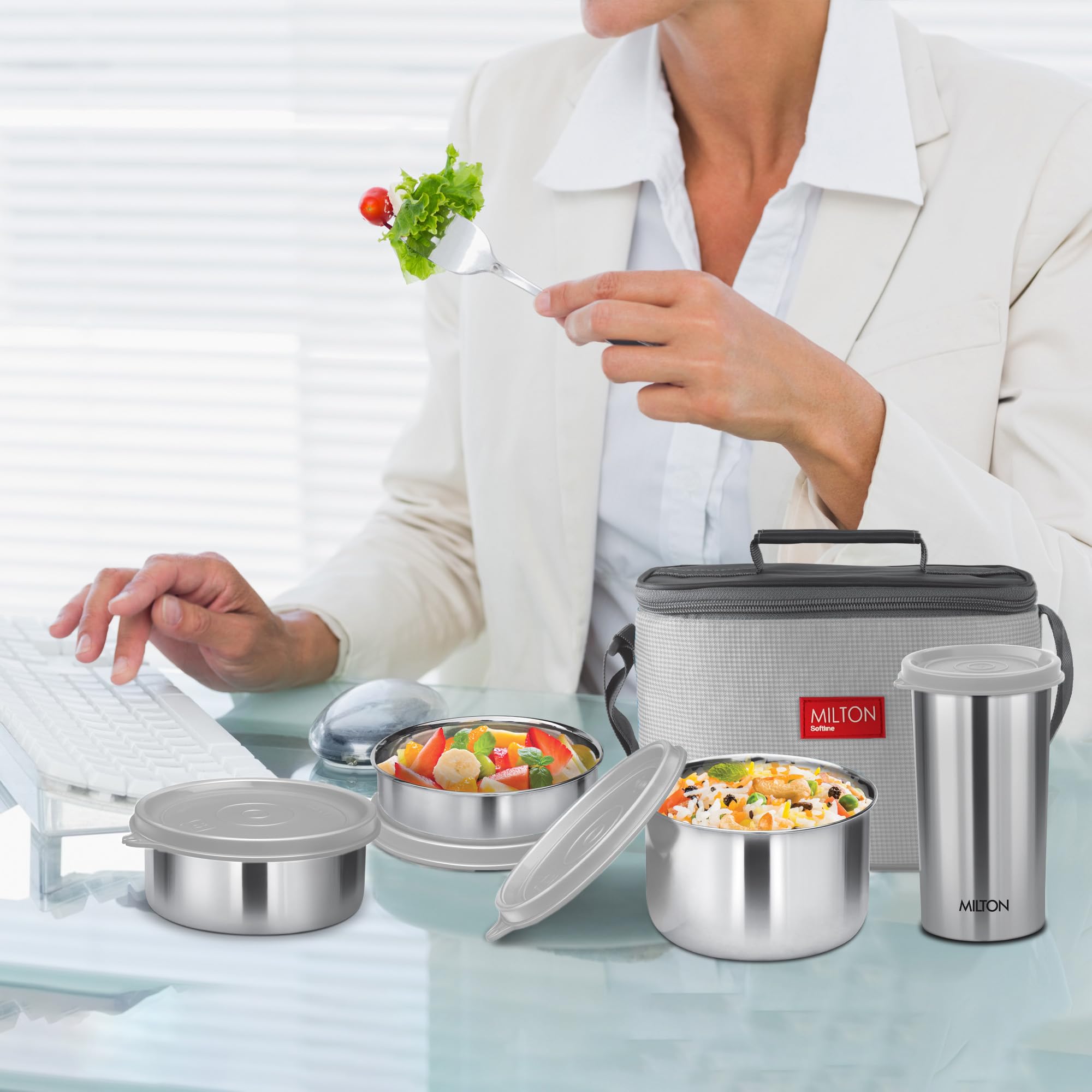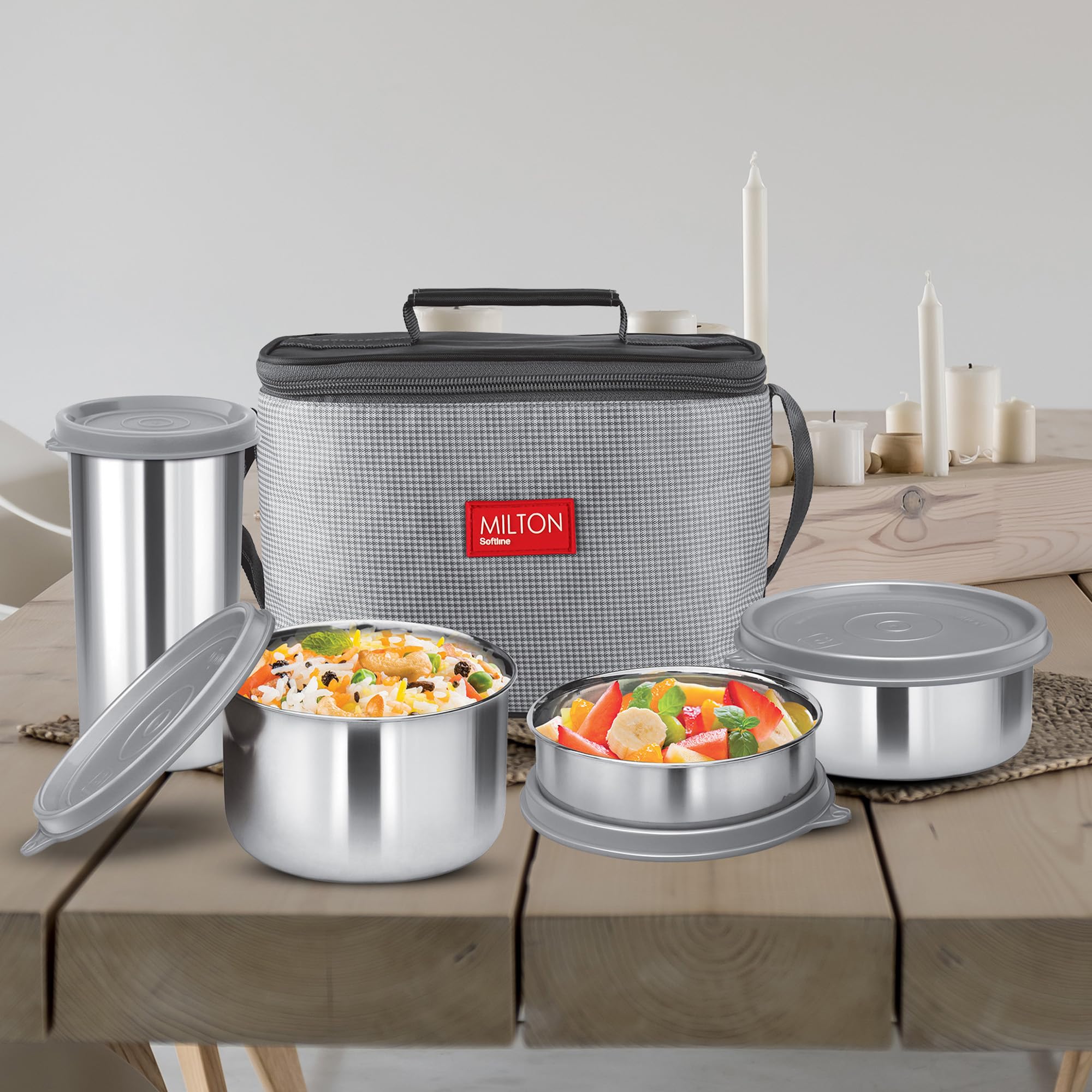 MILTON Delicious Combo Stainless Steel Insulated Tiffin with Jacket, Set of 3 Containers (200 ml, 320 ml, 500 ml) and 1 Tumbler-380 ml, Grey | Airtight | Dishwasher-Safe | Easy to Carry