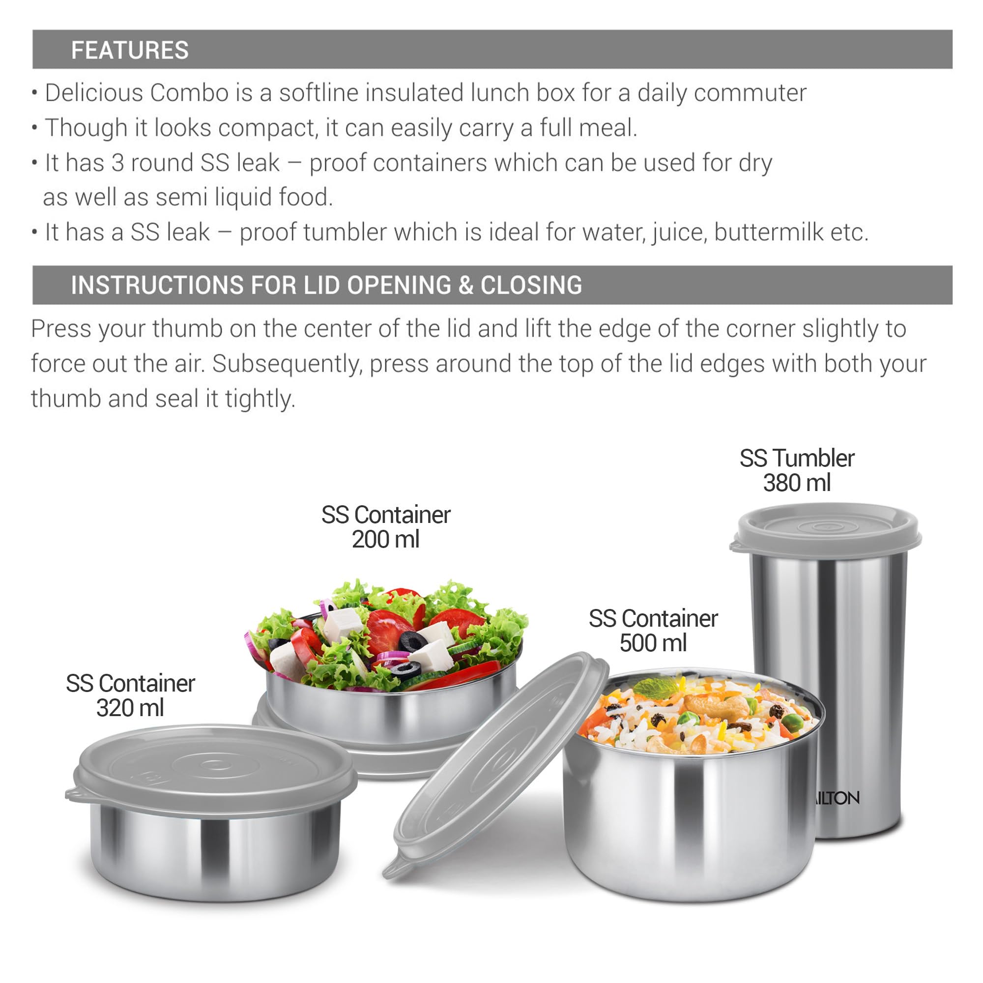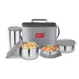 • Color: Grey Material: Stainless Steel Package Contents: 4 - Pieces Delicious Combo Set (containers - 200 ml 320 ml 500 ml and Tumbler 380 ml)