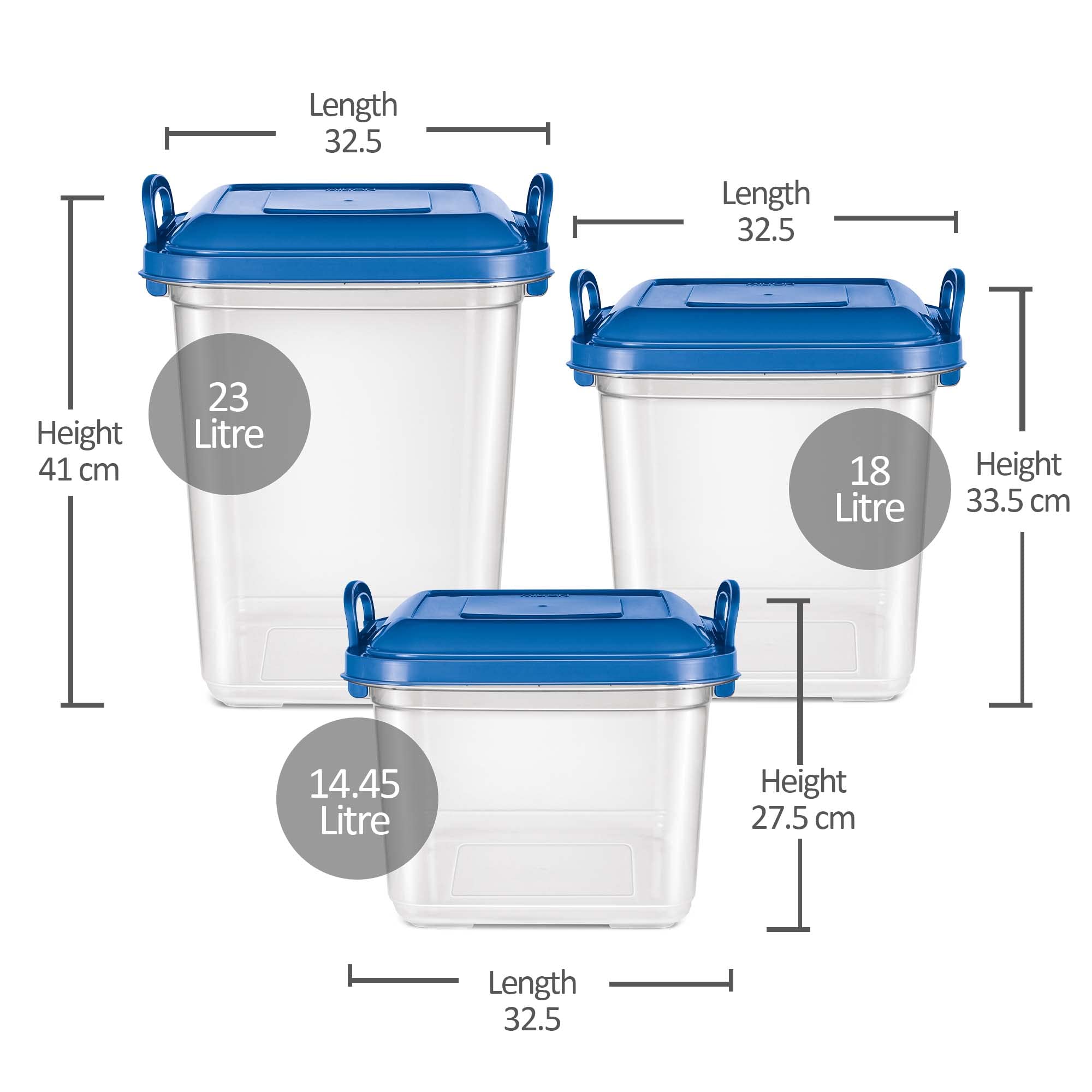 Material: Plastic; Color: Blue; Package Contents: 3 - Pieces Silo Containers Set (14.45 Litres 18 Litres 23 Litres) Dimensions (L x W x H)cms : 14.45L: 32.5 x 32 x 27.5 18L: 32.5 x 32 x 33.5 and 23L: 32.5 x 32 x 41.
