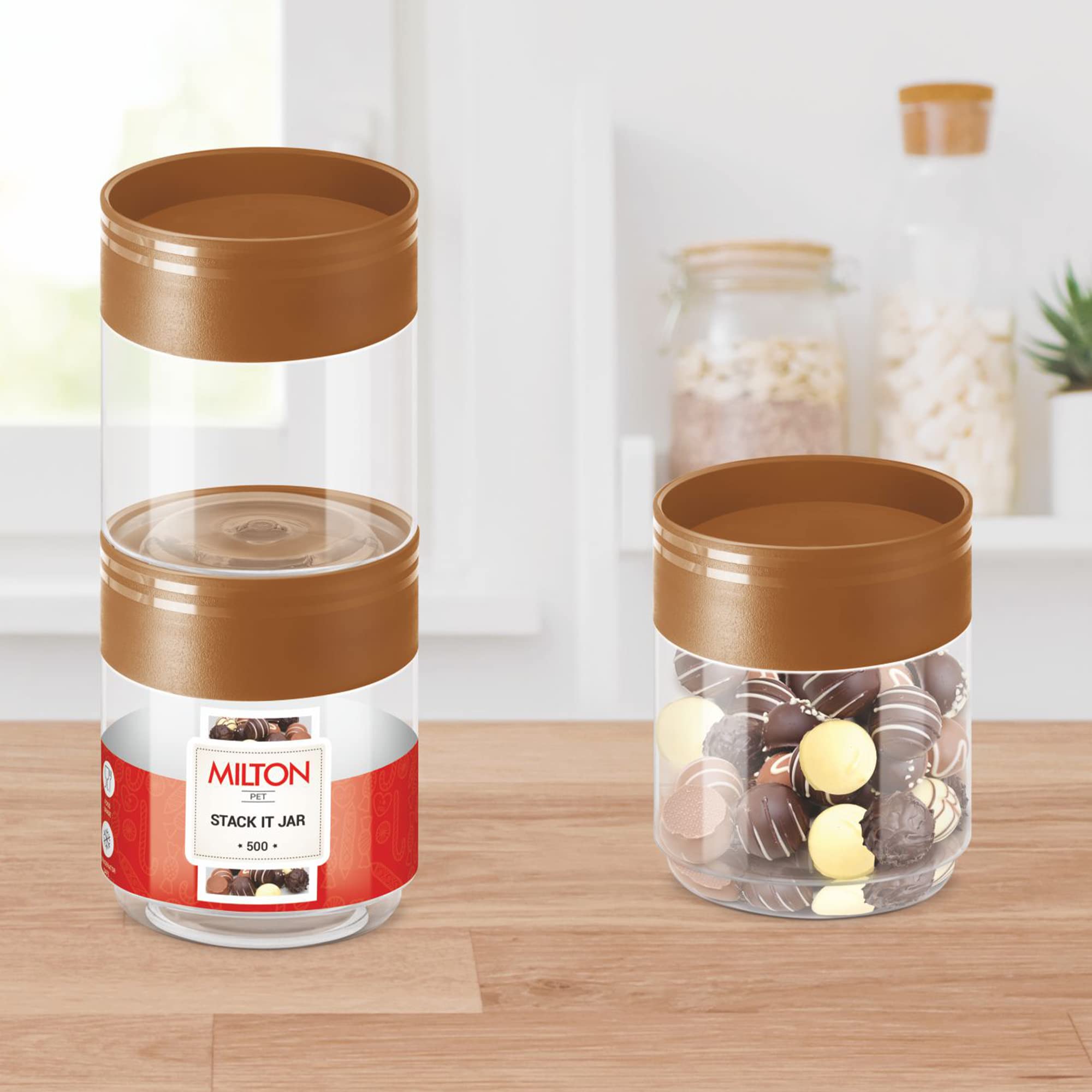 MILTON Stack IT 500 Airtight Plastic Storage Jar and Container Set Stackable BPA Free Transparent Containers for Kitchen Grocery Storage Multipurpose Organizer Set of 2 360 ml Each Brown