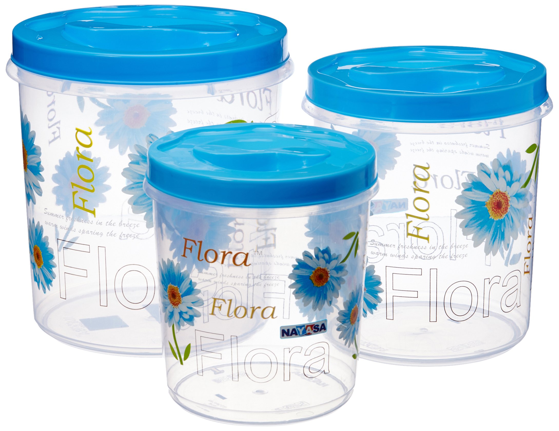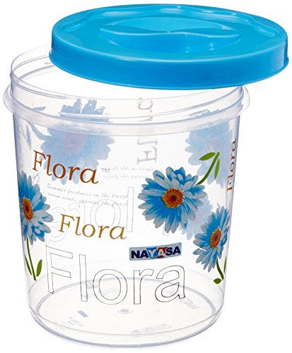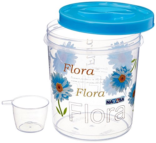 The Nayasa Polypropylene containers (set of 3) come in a set of 3 with a storage capacity of 4.7 litres 7.2 litres and 11.2 litres respectively. Bright floral print adorns the body and it has a blue easy to open cap. The canisters are semi-transparent and you can see what is inside without opening it.