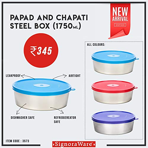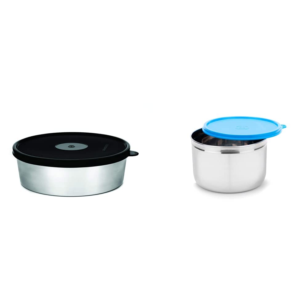 Signoraware Steel Papad and Chapati Box 1750Ml, Black & Signoraware Store Well Steel Container 1.1Ltr, 1Pc, Blue