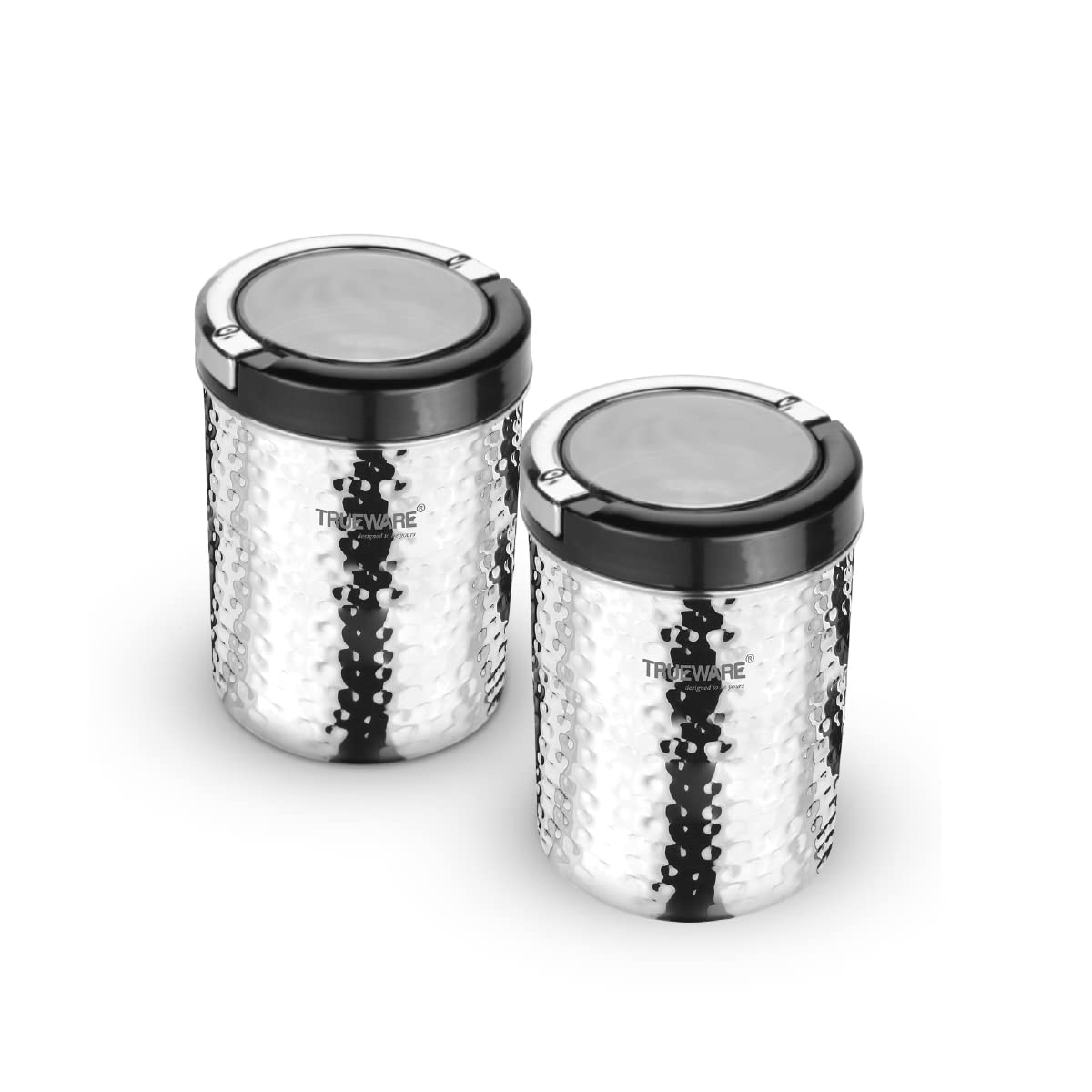 Trueware Airtight Iift up Plus Canister Set of 2 is made of superior quality of stainless steel. It has wide mouth for pouring in & out dry fruits sweets cookies chocolates candies and other dry snacks etc. It has transparent lid made up with polycarbonate material with chrome coated lift up handle to easily open the canister. It has Silicon ring which ensures airtight container and keep the content moisture free. Handy shape Canister with transparent lid that ensures you can see through inside easily. It is suitable for any kind of table and has a hammer steel finish. This set gives a classy look to your kitchen. It is perfect for gifting on any occasion.
