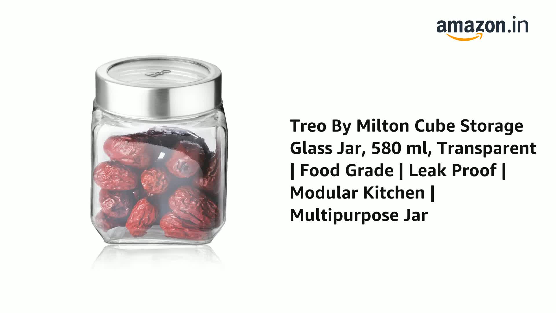 Treo by Milton Cube Storage Containers, 1 Piece, Glass Jar with Air Tight Steel Lid, 580 ml each, Transparent Jars for snacks, Pulses, Masala, Pickles, Cereals, Cookies, Dry Food