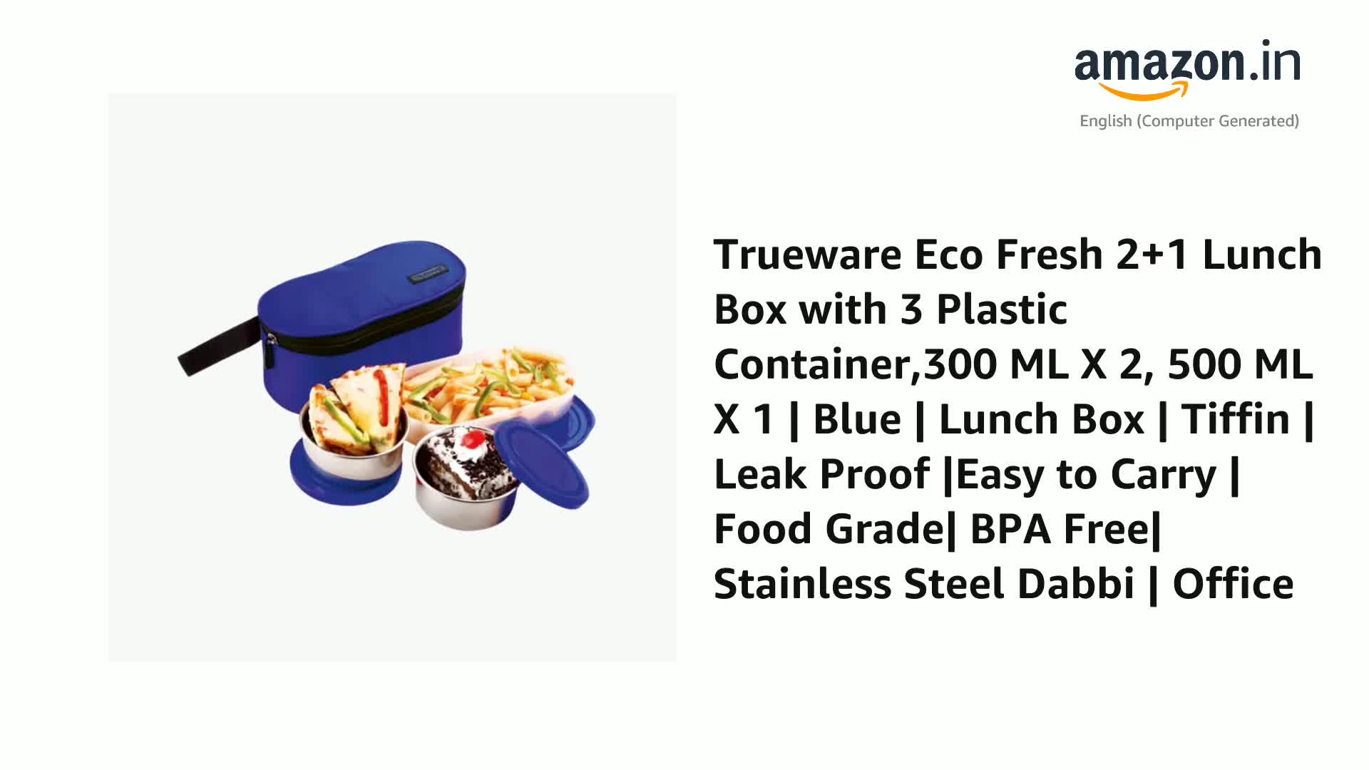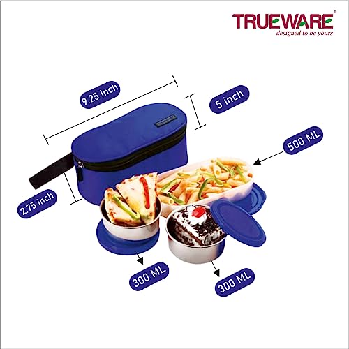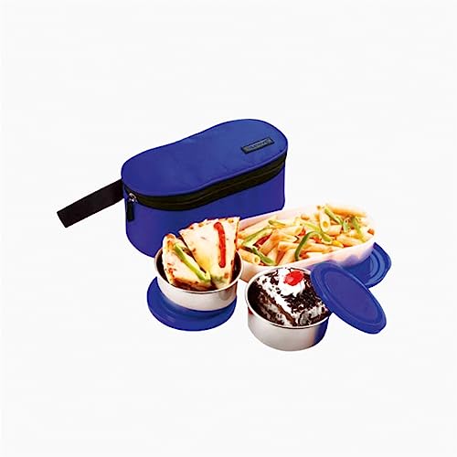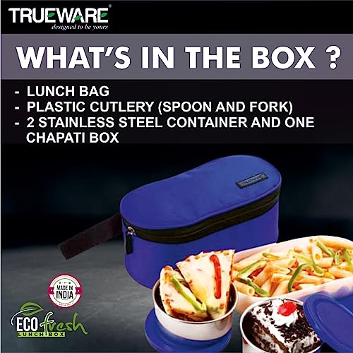 Trueware Steelex 4 Lunch box is made of double wall Polyurethane insulated Stainless Steel Containers. It helps to keep your meal hot and fresh for hours. Four durable Stainless Steel containers with Plastic (BPA free & FDA Approved ) Spill proof air vent cap. Air vent button on container lid helps in releasing air or steam for easy opening of container. This set is perfect for carrying all types of food items including curries rice chapatti sabzi etc. This Lunch Box comes with an integrated handle and carry belt which gives convenience to consumer for handling the product.