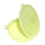 Tupperware Gadget - tiny Round "Clamshell" desing Pill Keeper. Hinged one-piece construction. Pill box measures only about 1 3/4 inches diameter by 3/8 thick. Fits into your pocket and will hold small medication tablets. Color is Sheer Margarita Green a yellow-green color.