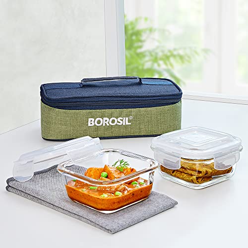 HomeKitchenContainersLunch BoxesBorosil Ace Series Lunchbox with Bag | 2pc Square Container Set (320ml Each) | Made in India Borosilicate Glass Tiffin | Microwave & Dishwasher Safe Lunch Box for Office, College & School | Horizontal