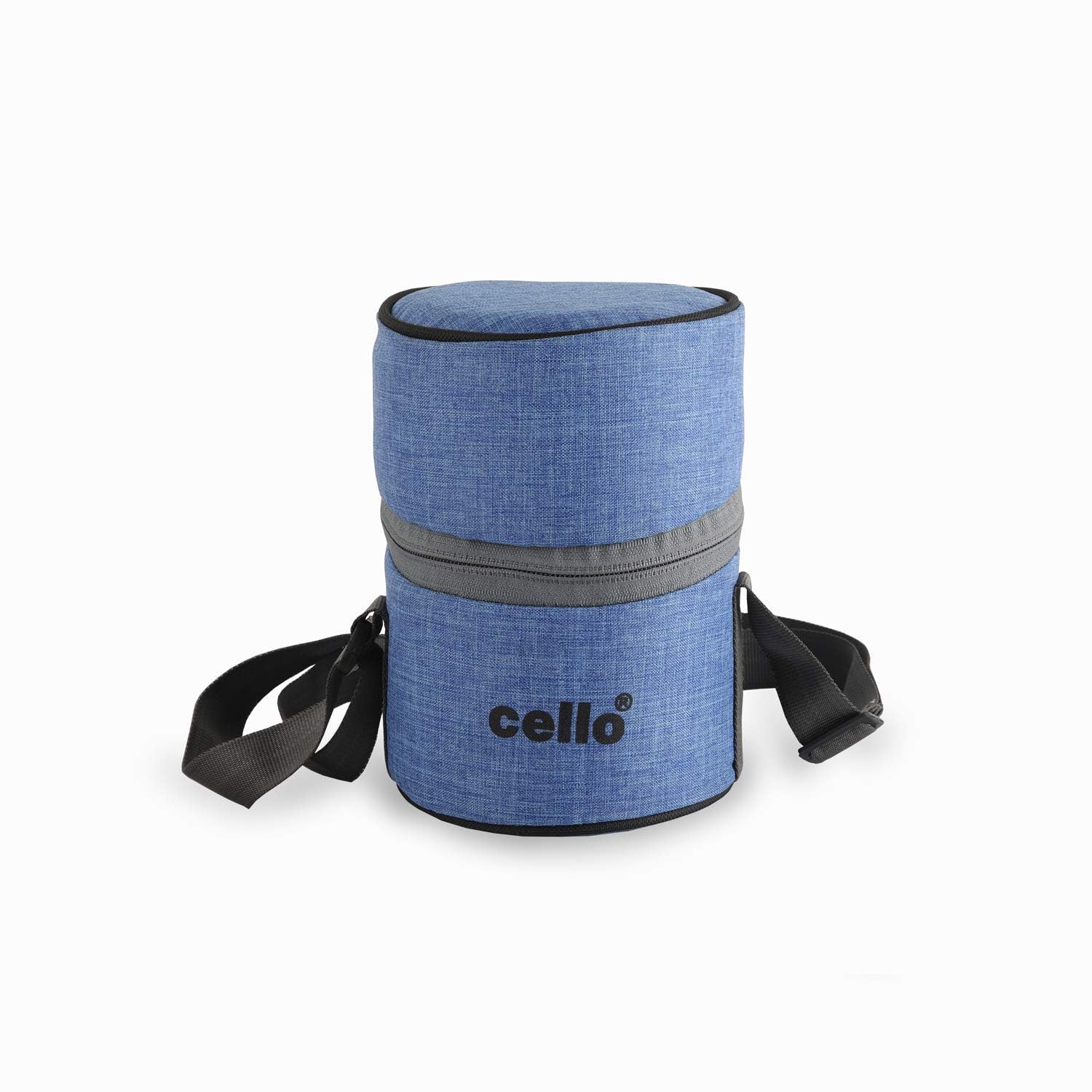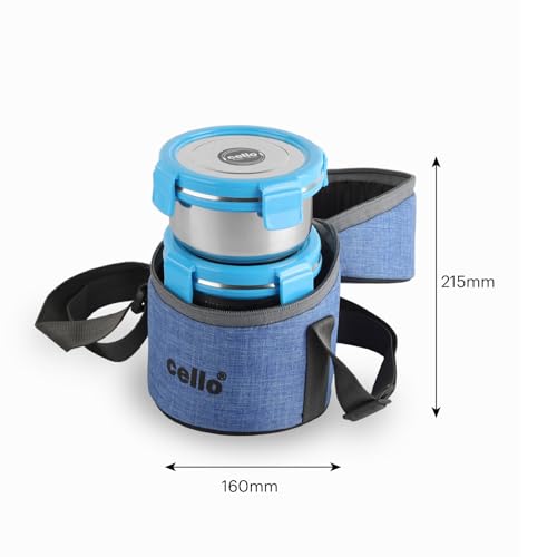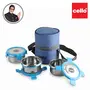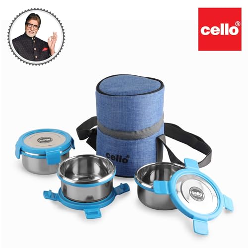 CELLO Pure Steel Lunch Box 3 Unit, Blue | Stainless Steel Lunch Box 3 Unit | Lunch Box with Jacket and Handle | Ideal for Office