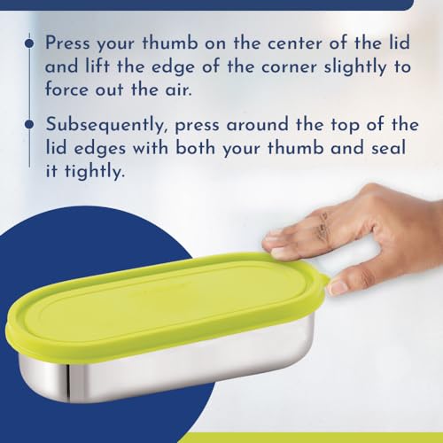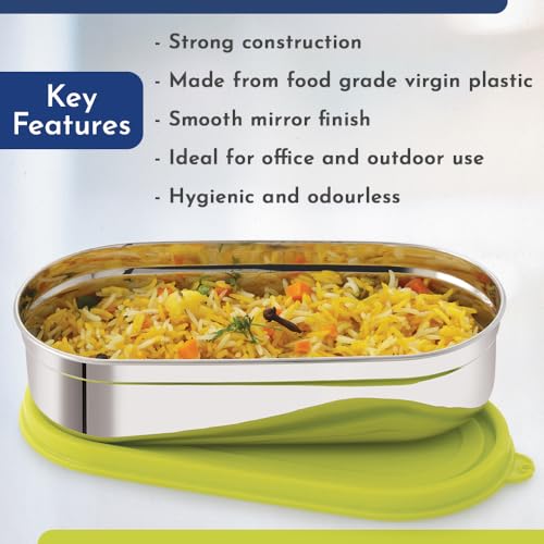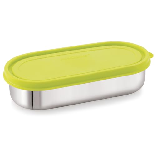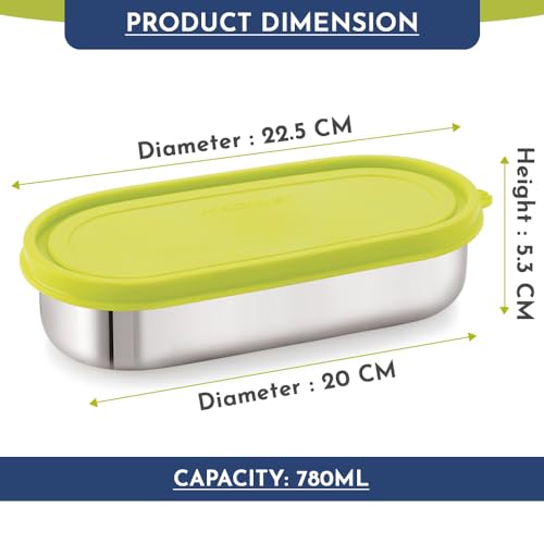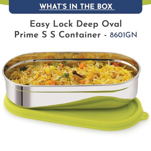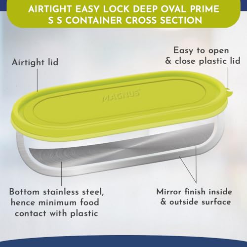 HomeKitchenContainersLunch BoxesMagnus Easy Lock Deep Oval Prime Deep Container, Stainless Steel, Airtight & Leakproof Lid & Container, For School, Office Picnic, Ideal for Men,Women and Kids (Green,780ml)