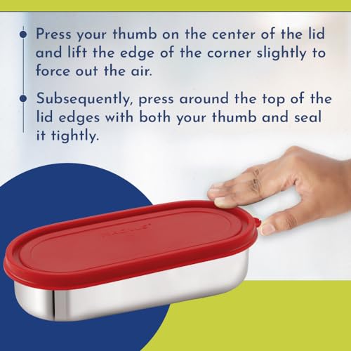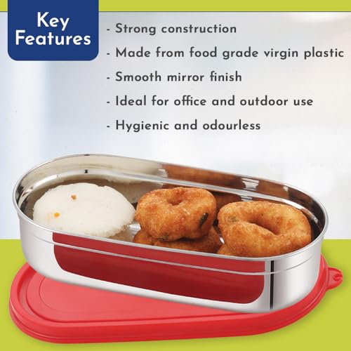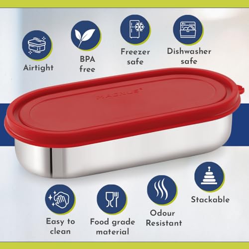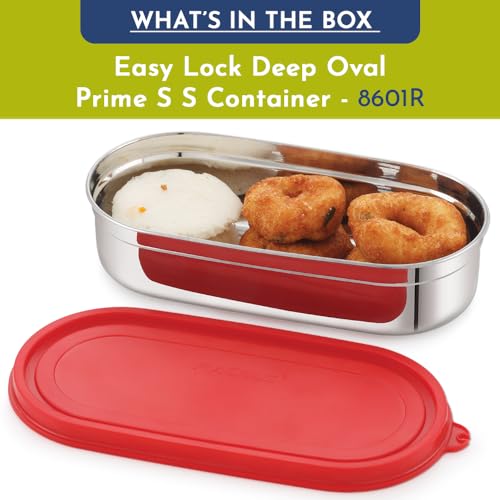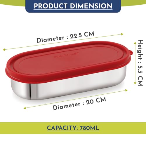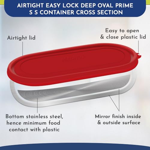HomeKitchenContainersLunch BoxesMagnus Easy Lock Deep Oval Prime Deep Container, Stainless Steel, Airtight & Leakproof Lid & Container, For School, Office Picnic, Ideal for Men,Women and Kids (Red,780ml)