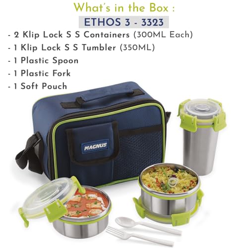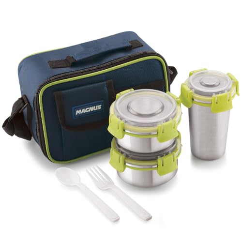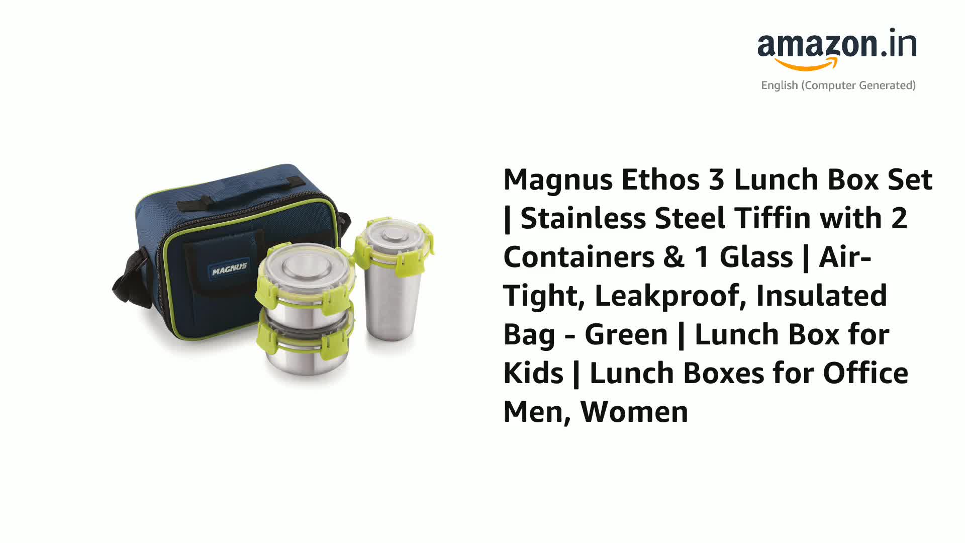Magnus Ethos 3 Lunch Box Set | Stainless Steel Tiffin with 2 Containers & 1 Glass | Air-Tight, Leakproof, Insulated Bag - Green | Lunch Box for Kids | Lunch Boxes for Office Men, Women