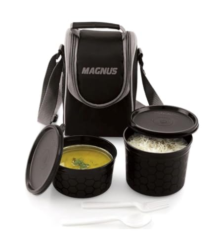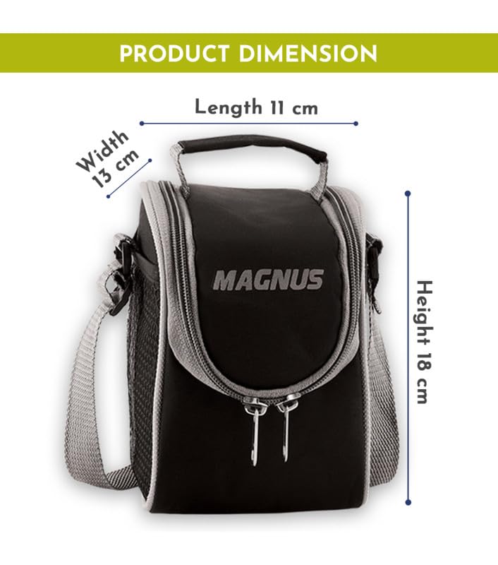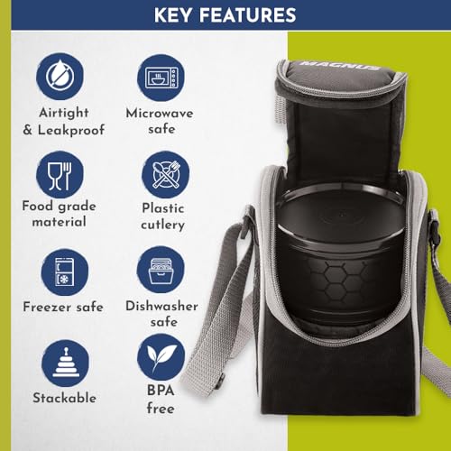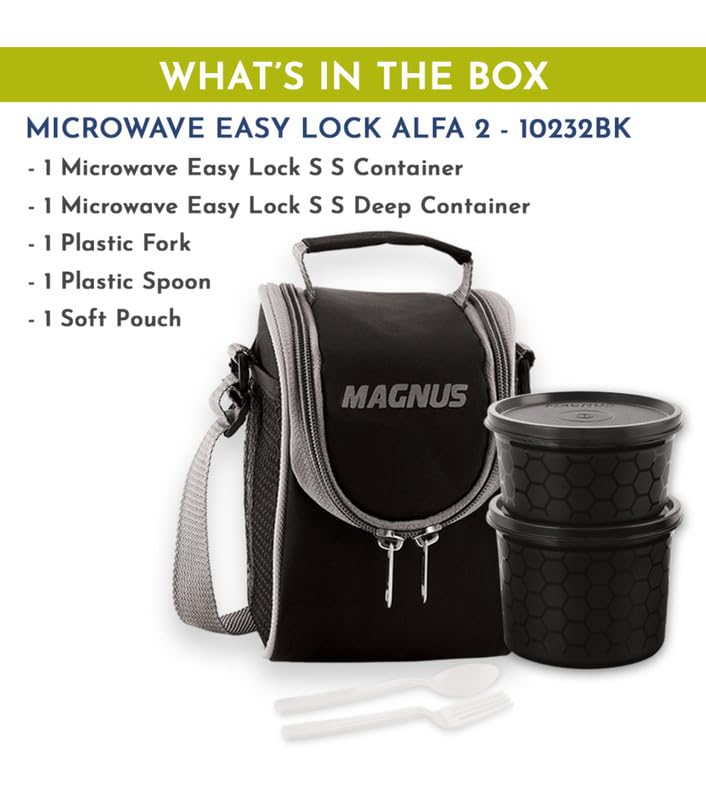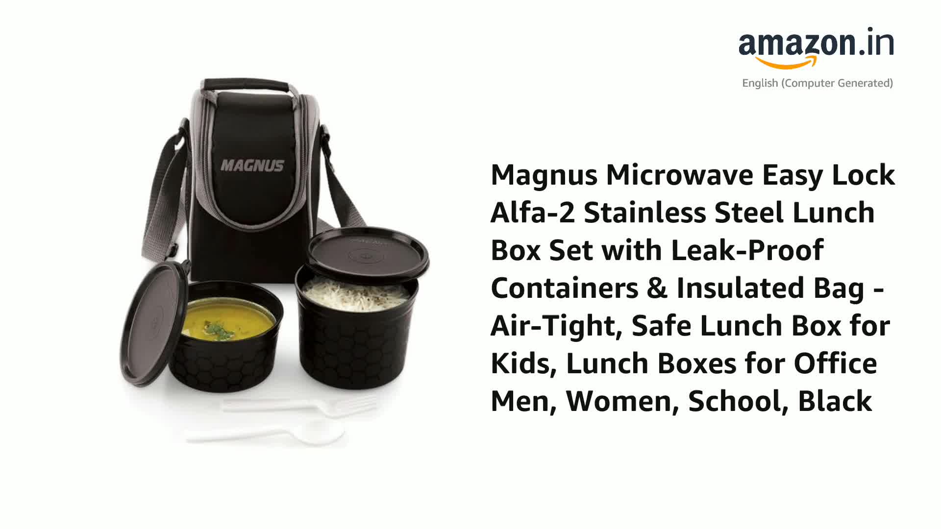 Magnus Microwave Easy Lock Alfa-2 Stainless Steel Lunch Box Set with Leak-Proof Containers & Insulated Bag - Air-Tight, Safe Lunch Box for Kids, Lunch Boxes for Office Men, Women, School, Black
