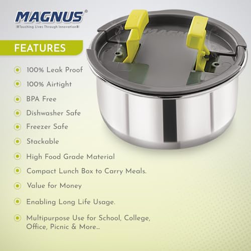 Leak-Proof Design: Experience the ultimate in convenience with our Magnus Olive-3 Prime Stainless Steel Lunchbox. This tiffin box for kids men and women features leak-proof containers ensuring that your meals remain fresh and spill-free whether for office