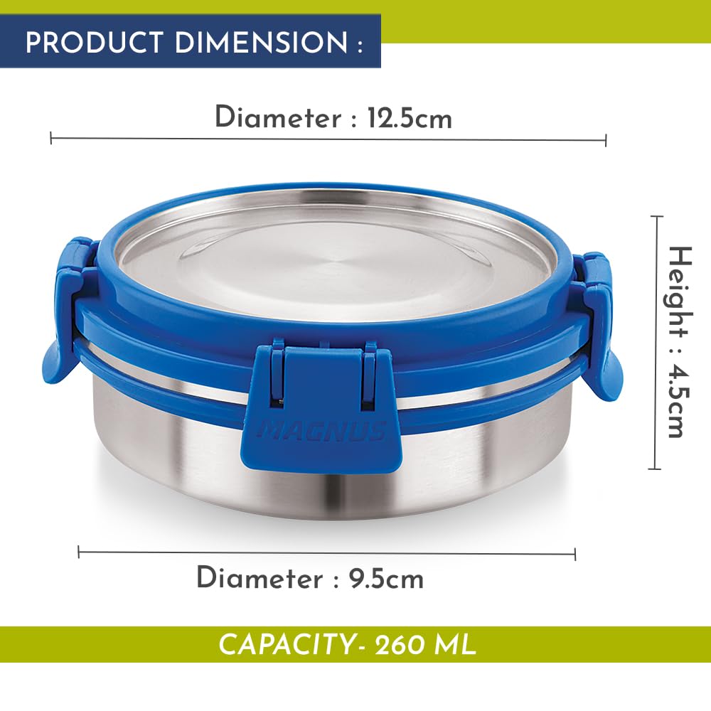 • Compact and Convenient Size: With a capacity of 260ML this container is easy to carry and store. Ideal for a steel lunch box for kids lunch box for school and steel containers for kitchen it fits perfectly into bags and lunch boxes making it a versatile k