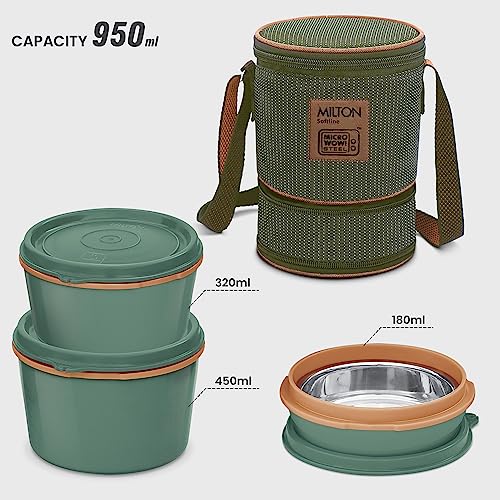 Milton Flexi 2+1 Inner Stainless Steel Lunch Box, Set of 3, (180 ml, 320 ml 450 ml), With Jacket, Green | Leak Proof | Microwaveable Steel | Food Grade