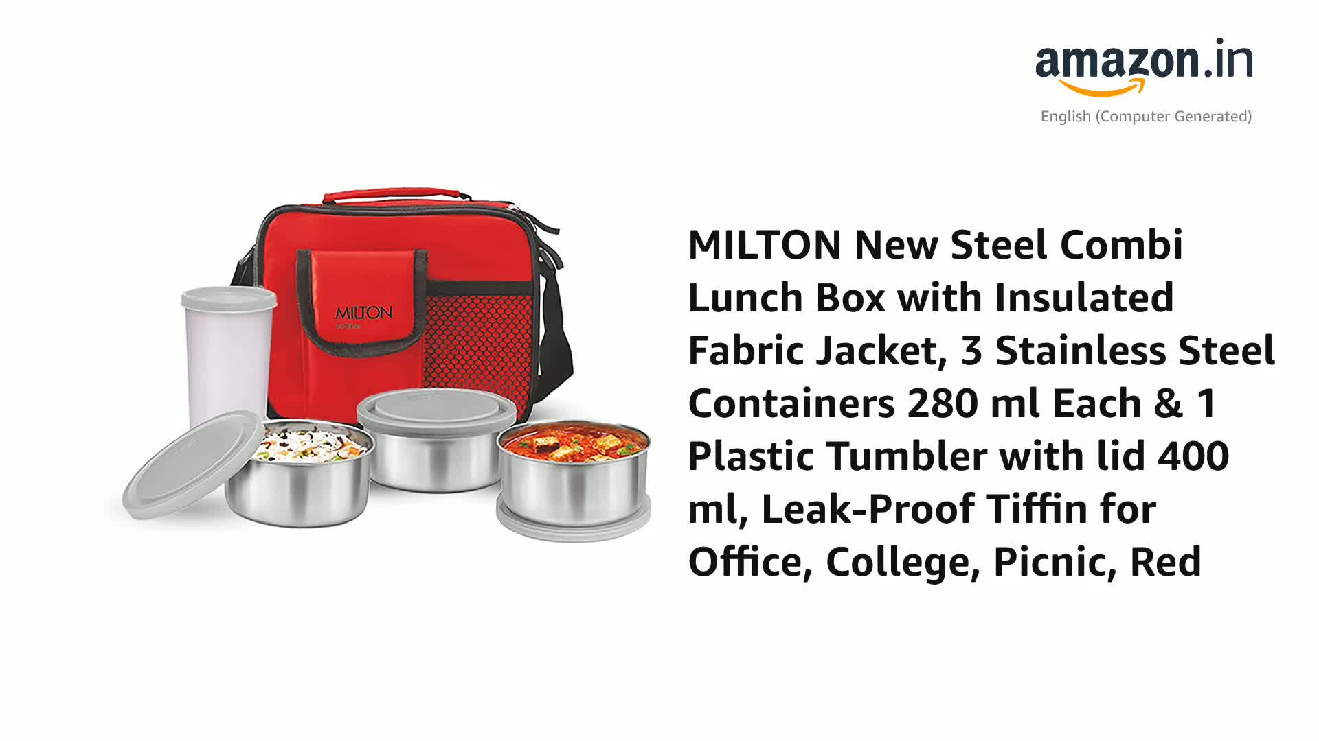 MILTON New Steel Combi Lunch Box with Insulated Fabric Jacket, 3 Stainless Steel Containers 280 ml Each & 1 Plastic Tumbler with lid 400 ml, Leak-Proof Tiffin for Office, College, Picnic, Red