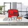 • Materia type: Stainless Steel; No. of containers: 4; Capacity of containers: 3 Containers: 260ml Each 1 Tumbler: 400 ml. ; Contents include: 3 Containers + 1 Tumbler + 1 Lunch Bag; Colour: Red