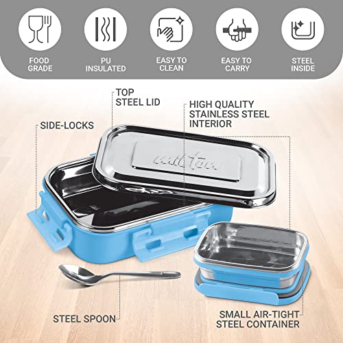 MILTON Steel Flat Insulated Inner Stainless Steel Tiffin Box, 700 ml, with Inner Stainless Steel Container, 170 ml and Spoon, Light Blue | Food Grade | Easy to Carry | Easy to Clean | PU Insulated