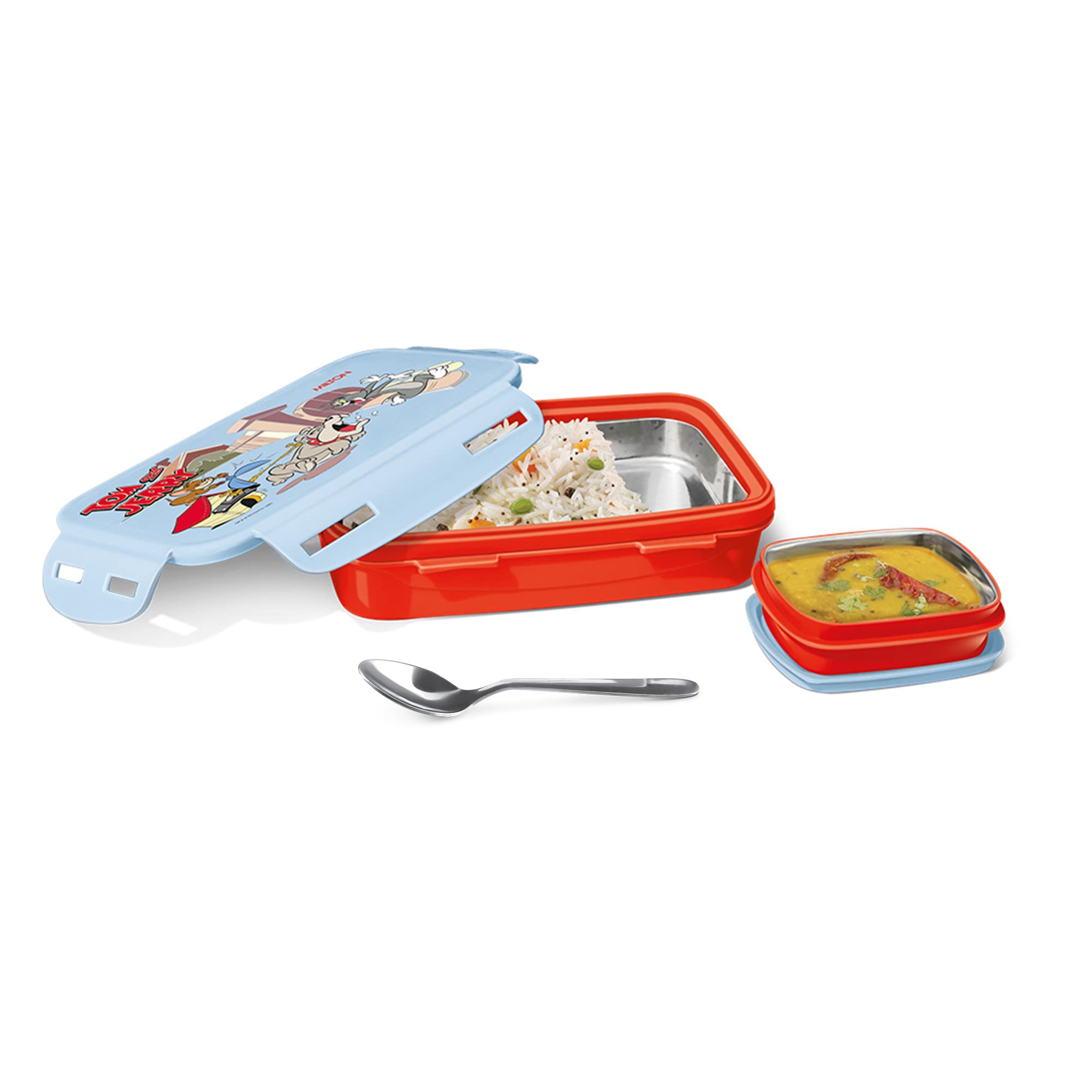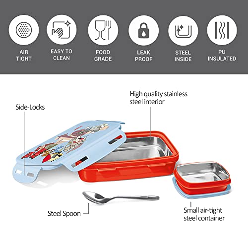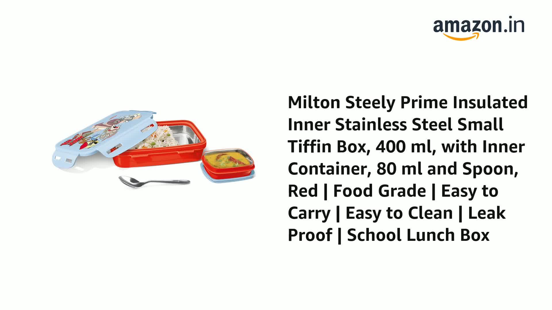 Introducing Steely Prime Lunch Box. The all-new Steely Prime is a perfectly sized lunchbox for kids to carry every day to school. The Cool Cartoon print attractive designs and vibrant colors of the lunch box will definitely make this tiffin your kids favourites. The insulation in it keeps the food hot for hours. The tiffin comes with a high-quality stainless-steel interior side locks a small leakproof steel container inside for gravy and curry and it contains a steel spoon. The sleek design of the tiffin makes it easy to fit in the school bag without occupying more space. Perfect to carry at school while travelling camping picnics. This product is under 1 year warranty from the date of retail purchase against any manufacturing defects in material and workmanship. The warranty does not cover damages resulting from accidents mishandling or tampering with the mechanism. Warranty valid against producing original bill endorsed by seller. For any queries kindly reach customer care number as mentioned on the product packaging along with the proof of purchase.