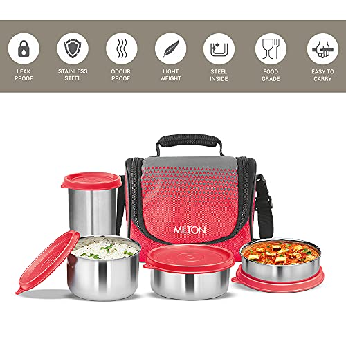 MILTON Tasty 3 Stainless Steel Combo Lunch Box, 3 Containers (200 ml, 320 ml, 500 ml) and 1 Tumbler, 380 ml, Red | Leak Proof | Easy to Carry | Odour Proof | Food Grade | Easy to Clean