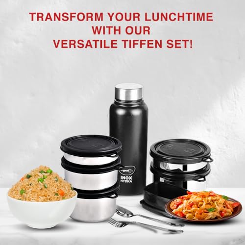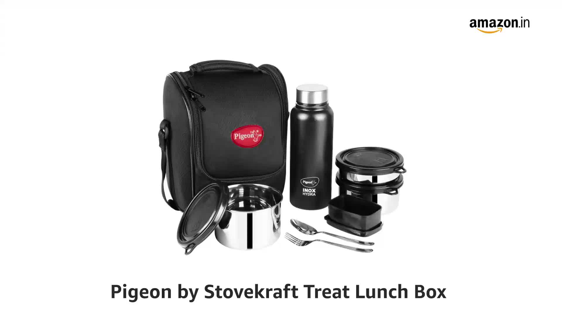 Pigeon by Stovekraft Treat Lunch Box with 700ml bottleSS spoon & fork3 Stainless Steel tiffin box with BPA free Leak Proof Lids (250ml 400ml 600ml)Plastic pickle box (100ml) Insulated tiffin bag