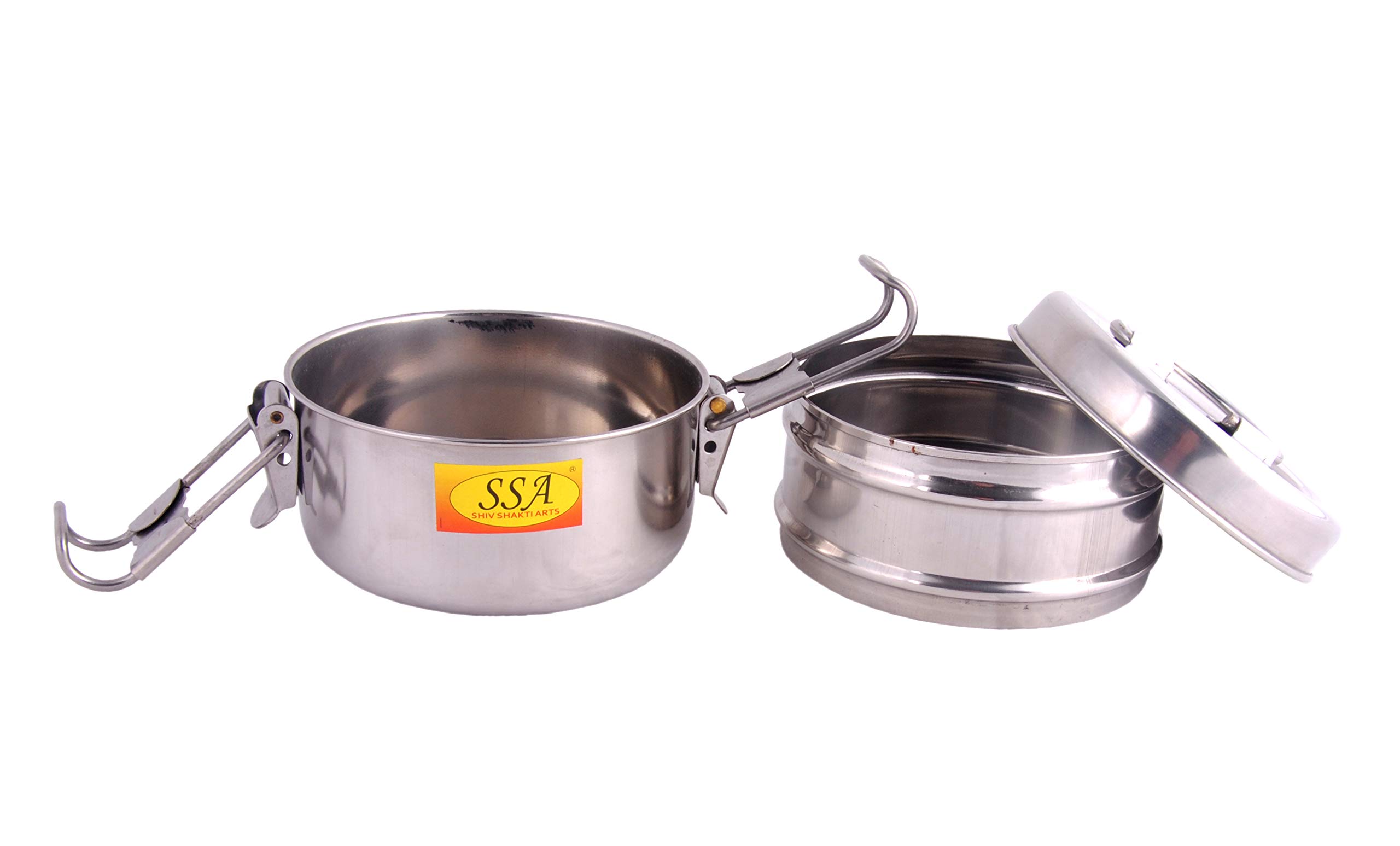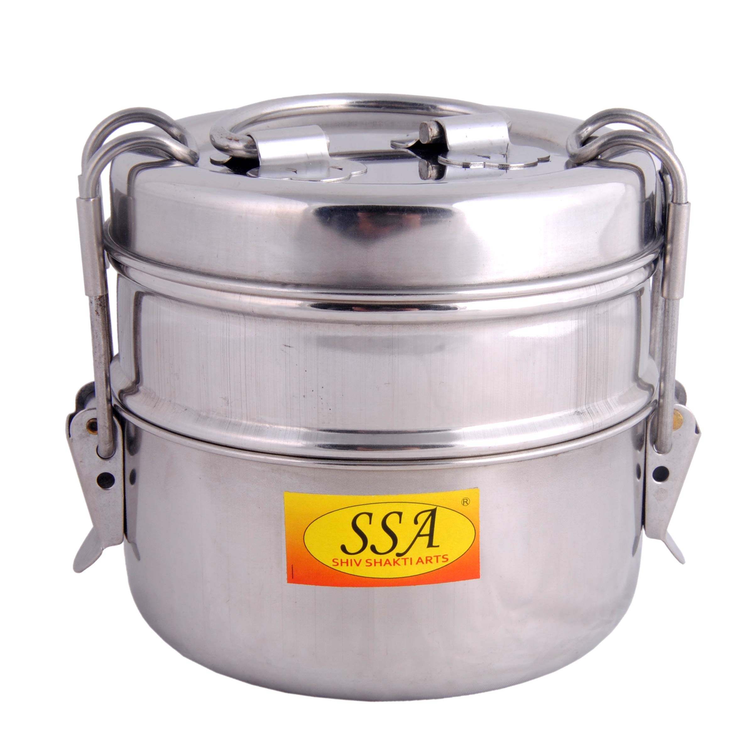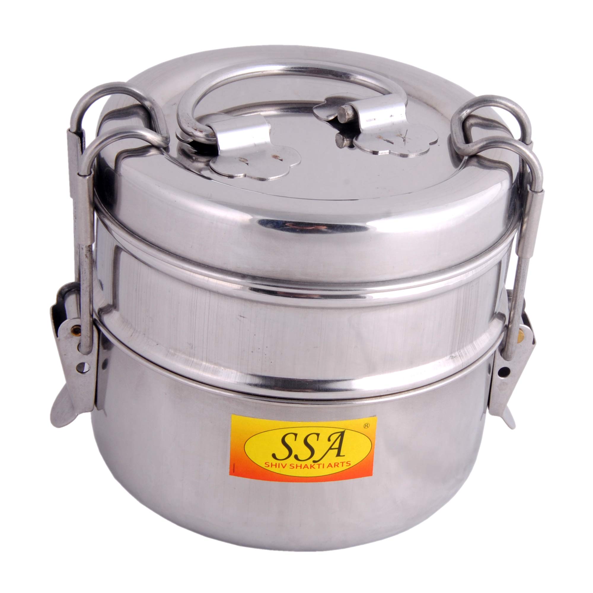 SHIV SHAKTI ARTS Stainless Steel Two Compartment Tiffin Box with Lid Silver Diameter-10 CM Size->7x2