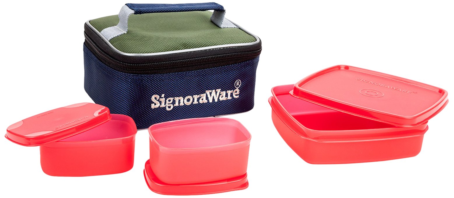 Signoraware Hot N Cute Plastic Lunch Box Set with Bag, 3-Pieces, Red