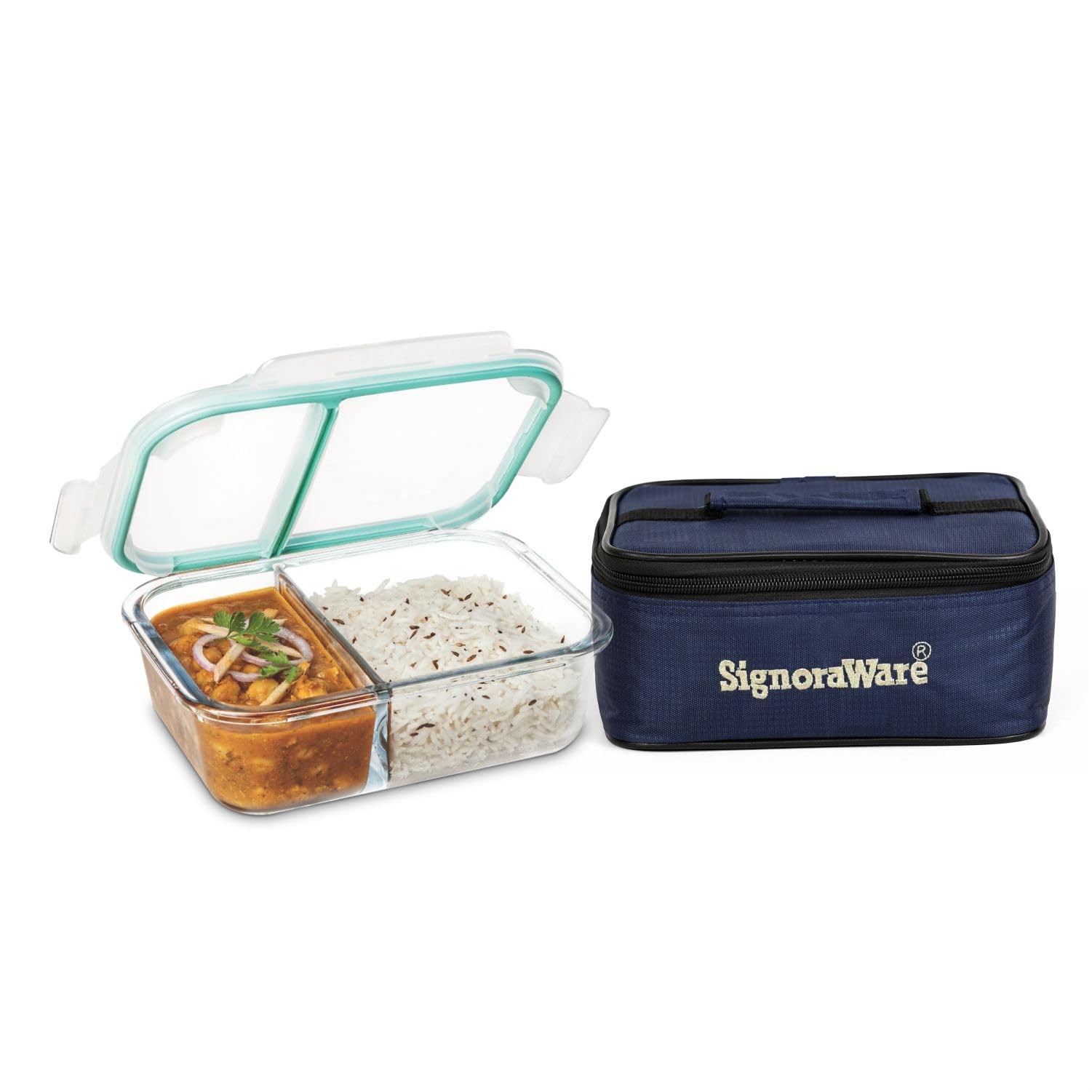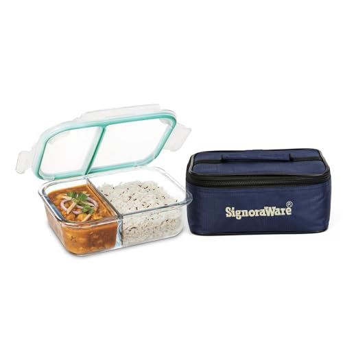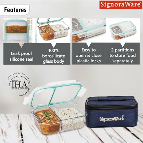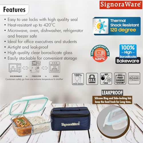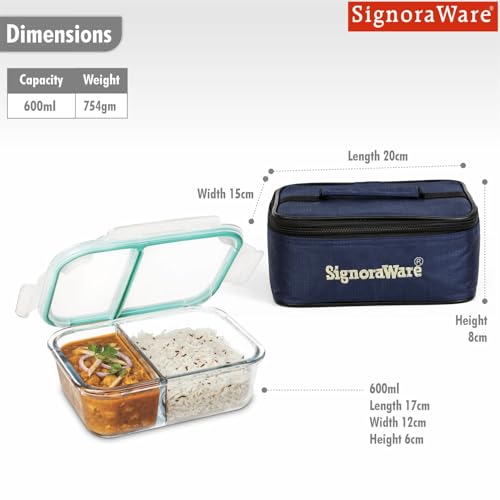 Signoraware Slim High Borosilicate Bakeware Safe Glass Small Lunch Box with Bag 600 ML transparent