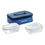 Materia type: Borosilicate Glass; No. of containers: 2; Capacity of containers: 2 Containers: 370ml Each; Contents include: 2 Containers (370 Ml Each) + Lunch Bag; Colour: Bag Colour: Blue | Container Colour: Transparent