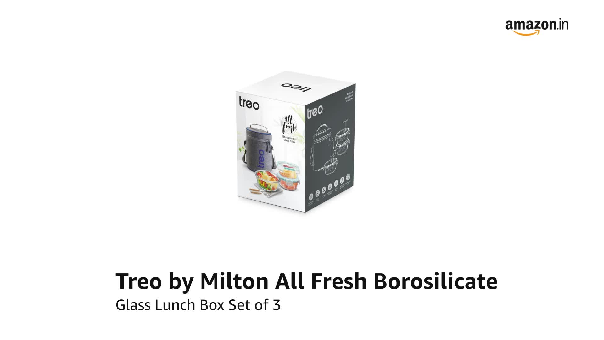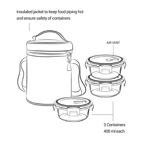 Treo by Milton All Fresh Borosilicate Glass Lunch Box Set of 3, Clear, 400 ml Each with Lunch Bag, Microwave & Dishwasher Safe, Leak Proof Containers Office Tiffin