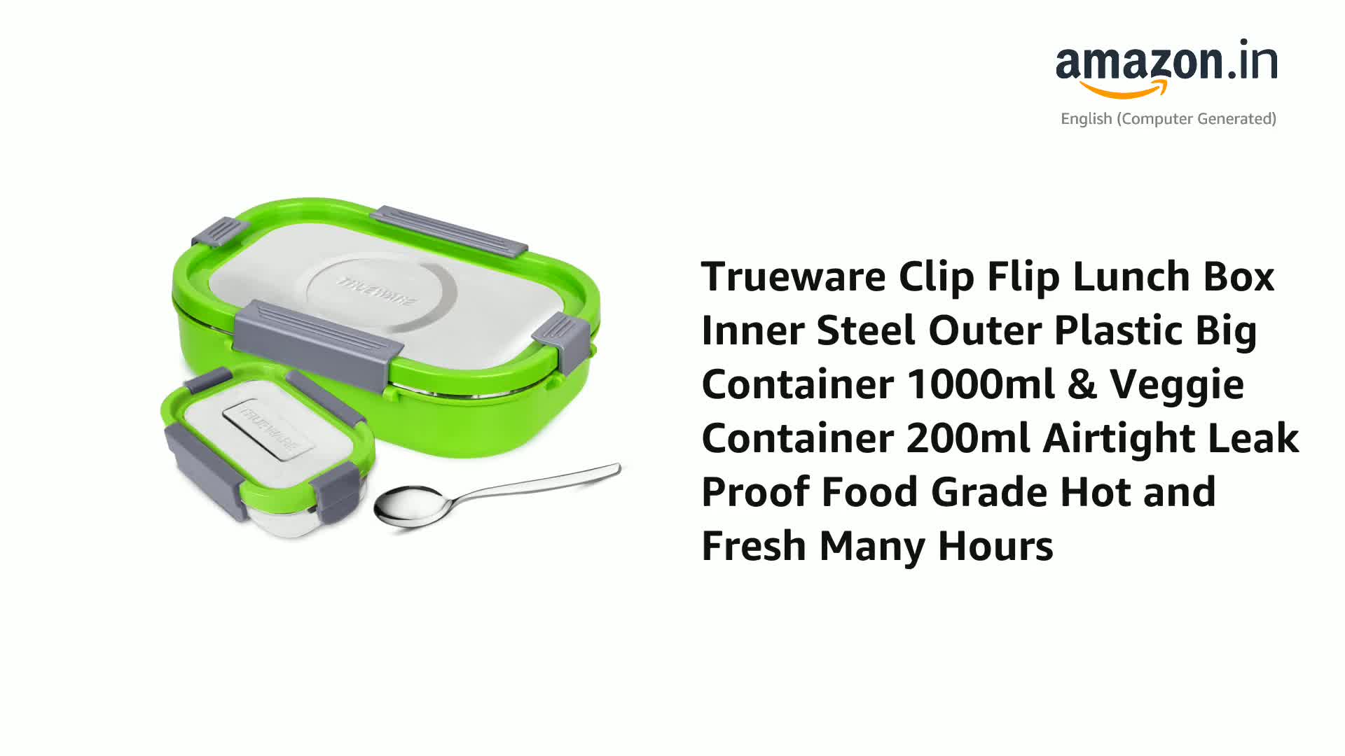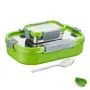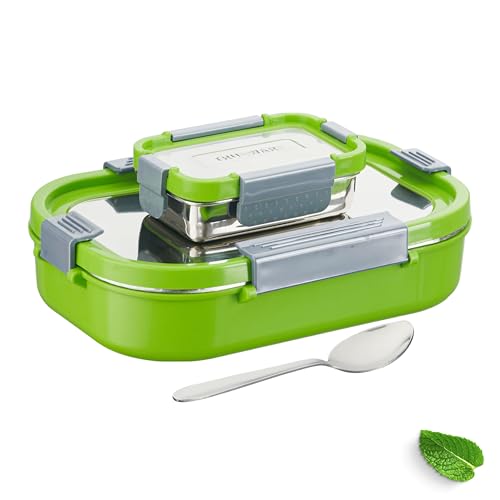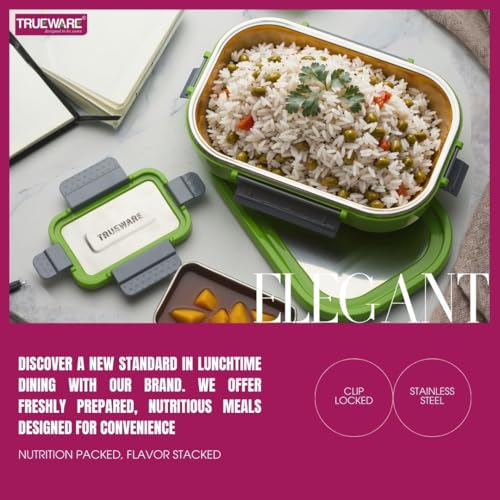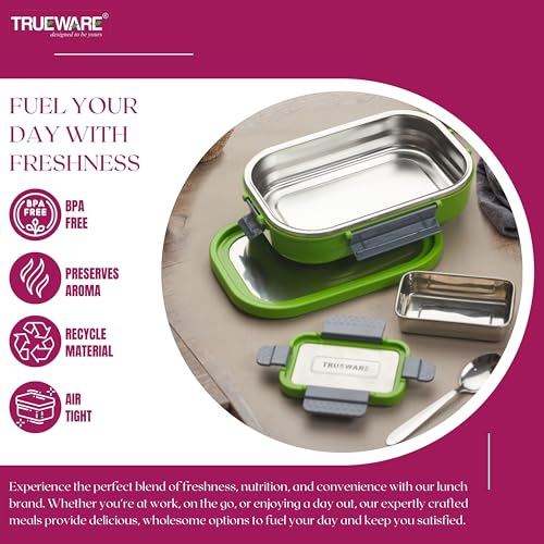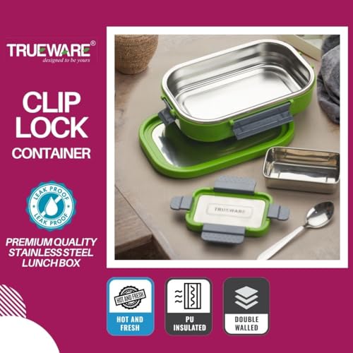 Trueware Clip Flip Lunch Box Inner Steel Outer Plastic Big Container 1000ml & Veggie Container 200ml Airtight Leak Proof Food Grade Hot and Fresh Many Hours (Green)