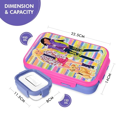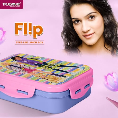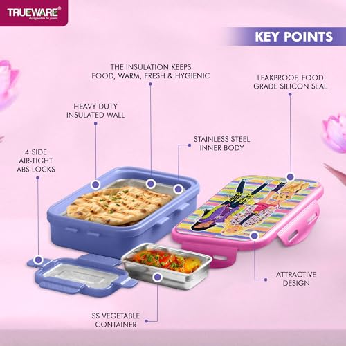 Trueware Flip Lunch Box Inner Steel Outer Plastic Big Container 900ml & Veggie Container 150ml Airtight Leak Proof Food Grade Hot and Fresh Many Hours (Pink)