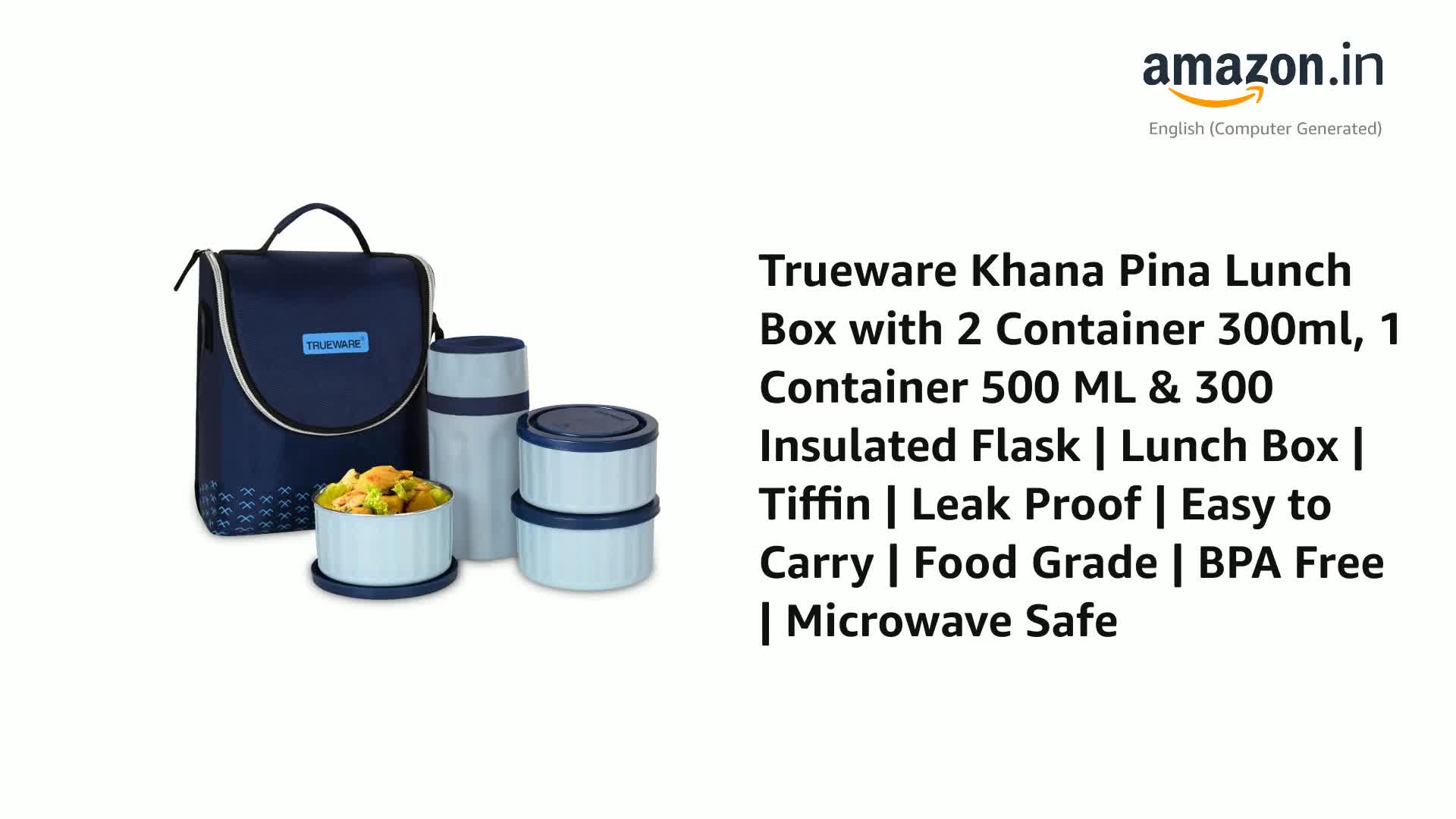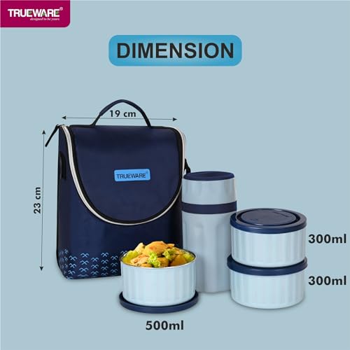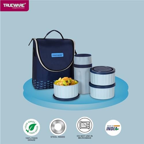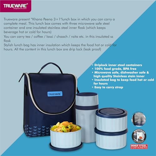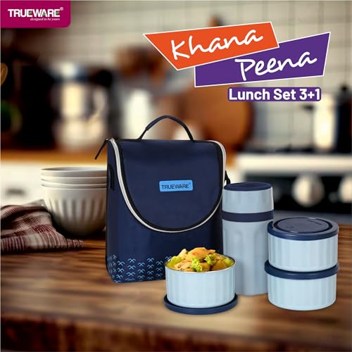 Trueware Khana Pina Lunch Box with 2 Container 300ml, 1 Container 500 ML & 300 Insulated Flask | Lunch Box | Tiffin | Leak Proof | Easy to Carry | Food Grade | BPA Free | Microwave Safe