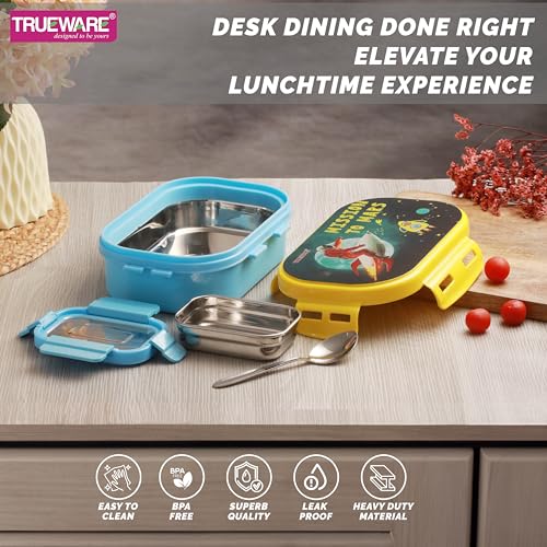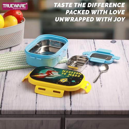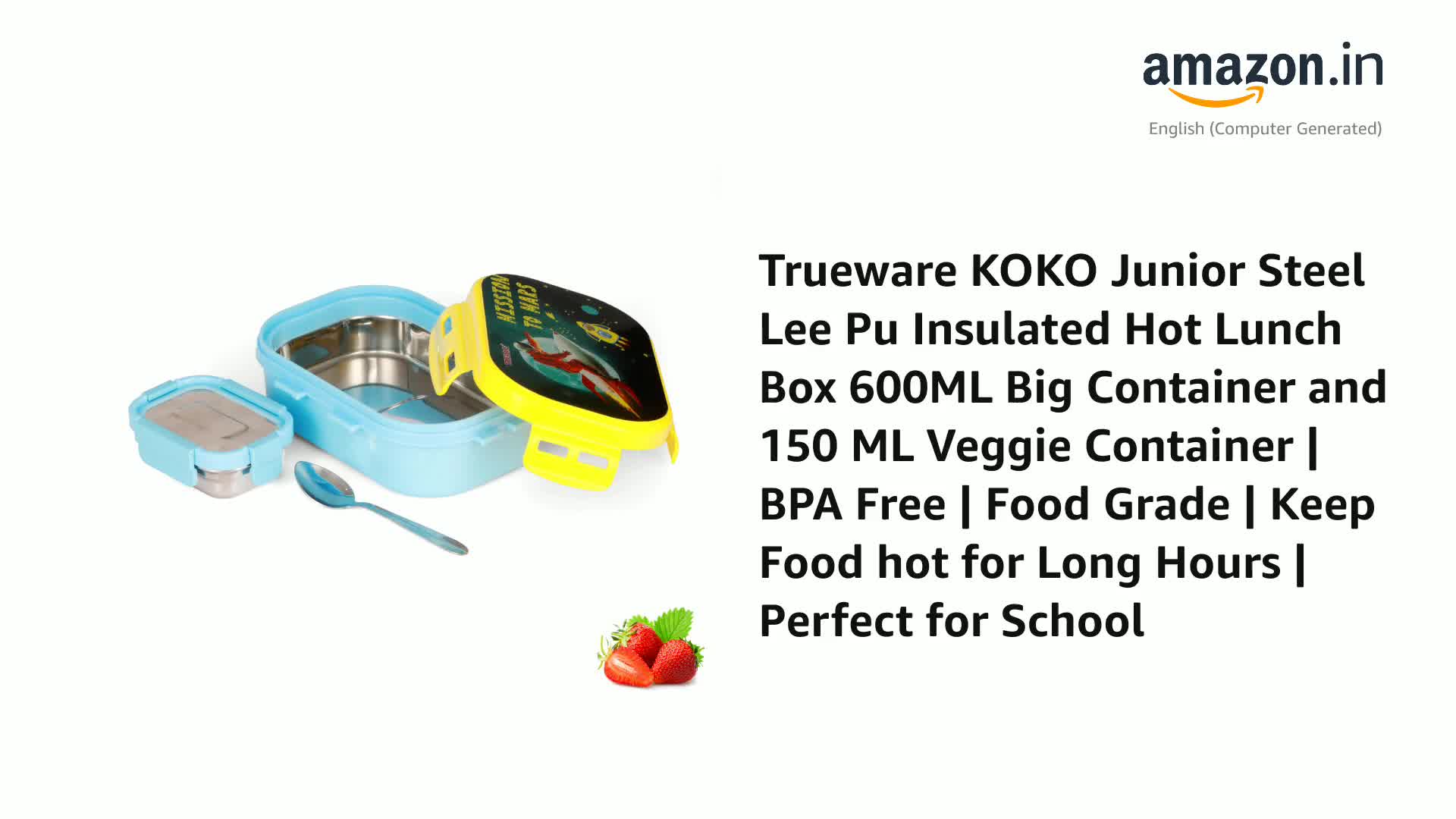 Trueware present KOKO Stee-Lee Lunch Box. New Complete veggie container with both inside and outside steel. Keep Food hot for long hours. Perfect for school going Kids and office. Made in India. Attractive Design. Drip Lock High Quality Stailess Steel BPA Free Food Grade FDA Certified Keep Food Hot for Long Time Leak Proof Container for Dry and Wet Food Air Tight Double Wall Pu Insulated 1 Big Container & 1 Veggie Container Hot and Cold Easy to Clean Made in india Stainless Steel Inner Silicon Seal Backpack compatible Spill leak-proof design 4 Sided Drip lock Insulated Lunch Box attractive designs 1 Stainless Spoon included.
