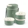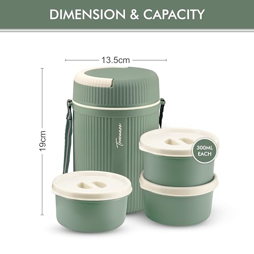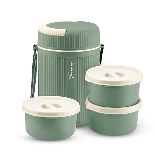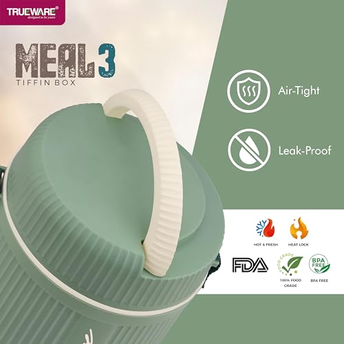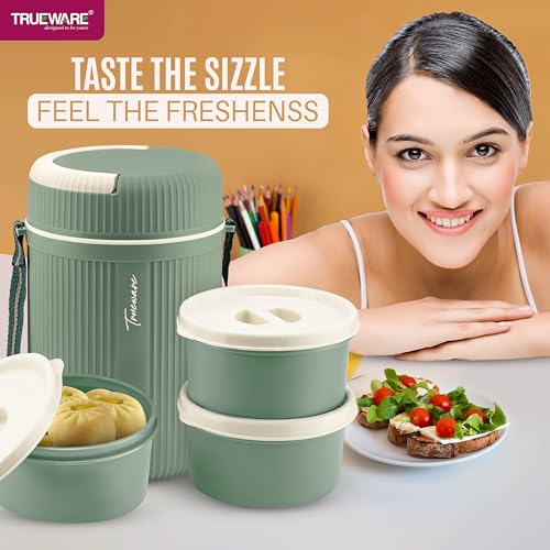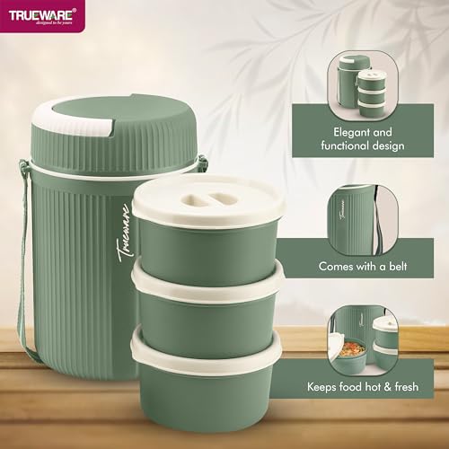 Trueware Present MEAL 4 Insulated Hot and Cold Lunch Box With 3 PP Container 300 ML Each & 1 PP Container 200ML. Elegent and functional Design. Come with the belt and Stulus & Secure Handle Keep Food Hot and fresh many hours. Mess Free Seperated Containers. 100% Food Grade Material. BPA Free Airtight Hot and fresh many hours High Quality Plastic used creak proof. Meal 4 Tiffin Lunch Box set is an ideal choice for carrying your meals to work and keeping them hot for a long time. While most home- cooked meals grow cold and lose their taste by lunchtime the double-walled insulation system of this set in the heat. The included containers let you carry multiple items of your choice and prevent them from leakage. The secure handle aids in portability and makes it easy for you to carry this lunch box anywhere.